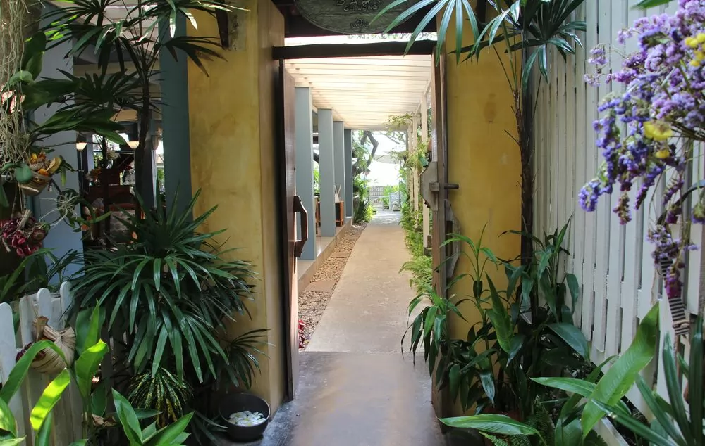 巷子底出現招牌,左邊有庭園的小步道,這咖啡屋的入口真的很不起眼,但是走進去卻是華麗的叢林花園設計,讓人放棄坐古屋1樓的想法,咖啡店的花園式甜點屋,以及露天用遮陽傘下的用餐區,被綠棕櫚樹和鮮花所圍繞,精緻十分愜意。