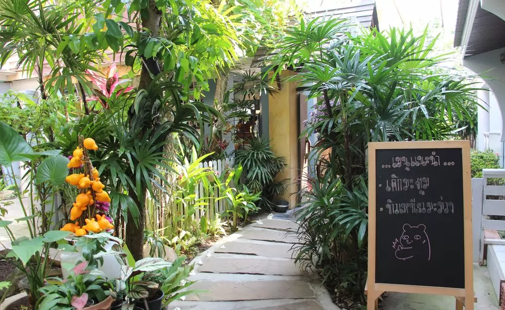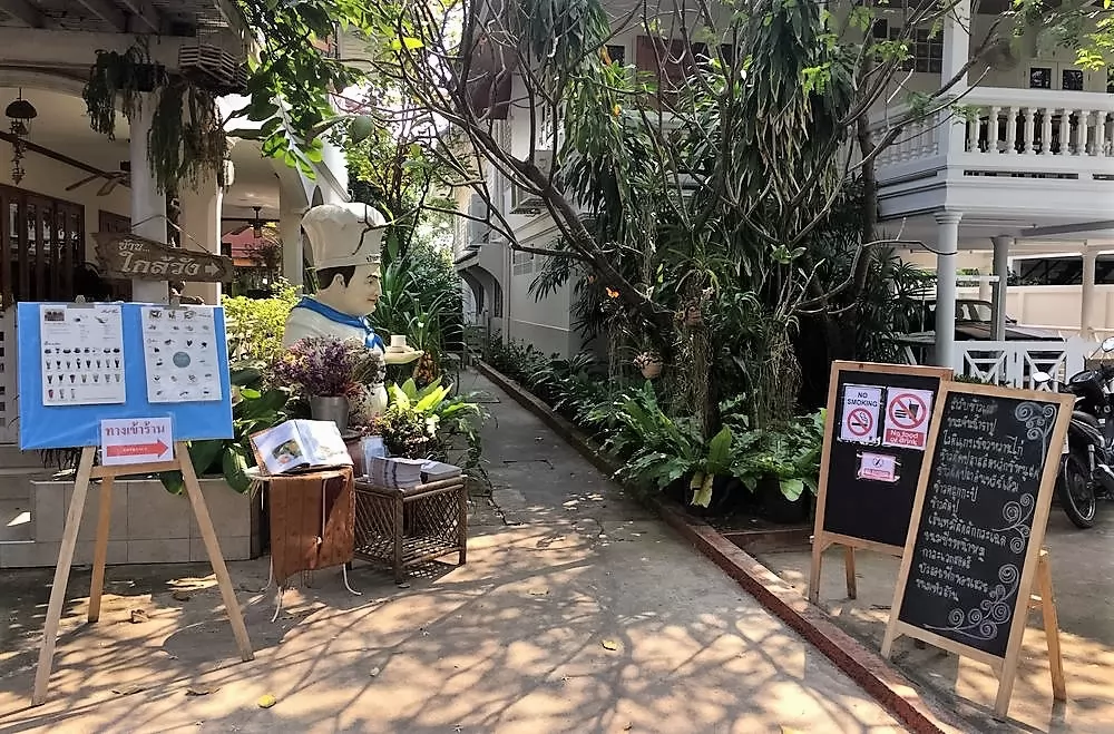 其實從入口處看,像是有錢人家的大庭院,根本看不出來裡面有啡屋,古屋鐵門引出景深的步道,步行幾十公尺,看到大廚師像右手端著蛋糕、左手則是咖啡,Baan Khrai Wang的路標指著再往裡走。