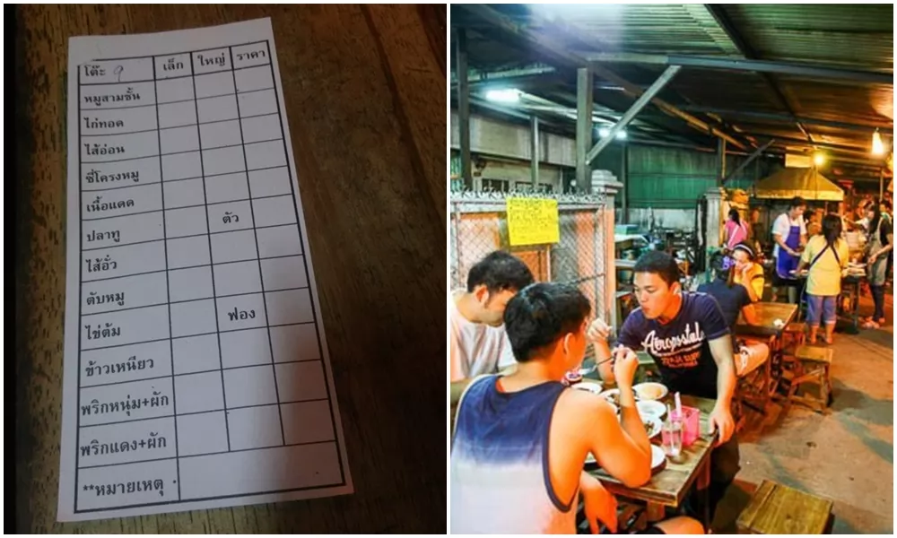 菜單只有菜品和分量,沒有圖片和價格,而且種類不多:1. 三層豬肉、2.炸雞、3.豬腸子、4.香腸、5.牛肉、6.巴土魚、8.豬肝、9、水煮蛋、10.糯米飯,左邊第二排是小份、第三排是大份的,最右邊是價格,在要點的項目中寫上數量即可。