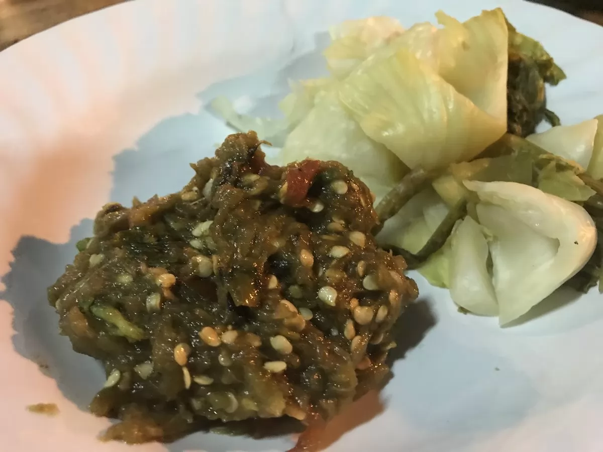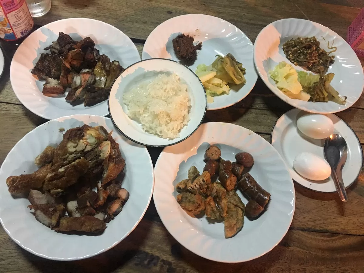 如果是3、4人來,建議點大份的三層豬肉、炸雞、小份豬腸子、水煮蛋,配上這裏超有嚼勁的糯米飯。一手拿炸肉一手捏糯米飯,滿好吃的,吃膩了還可點素菜辣酱,清爽一下口味。店家很酷的只提供礦泉水,其餘飲料一概沒有。