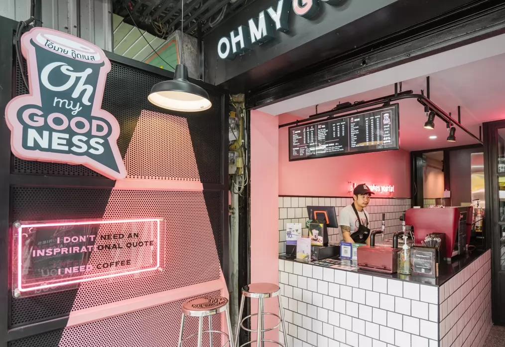 Oh My Goodness以黑色和粉色為主色調,店面緊湊。這家咖啡店主打低卡路里飲料,降低甜度的同時保持美味還不會讓人變胖,保證讓咖啡和可可控們滿意。