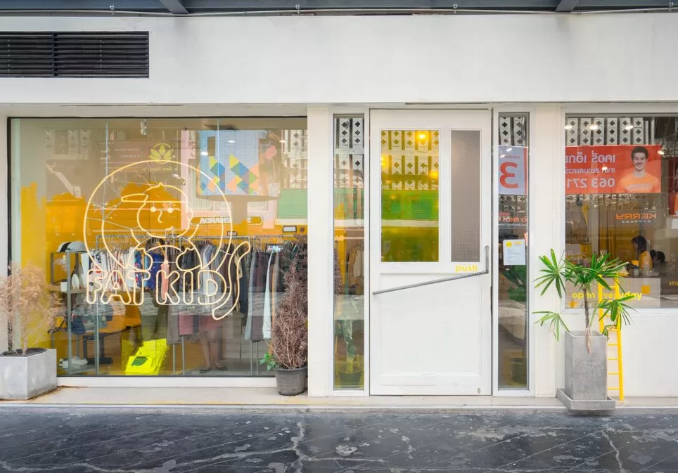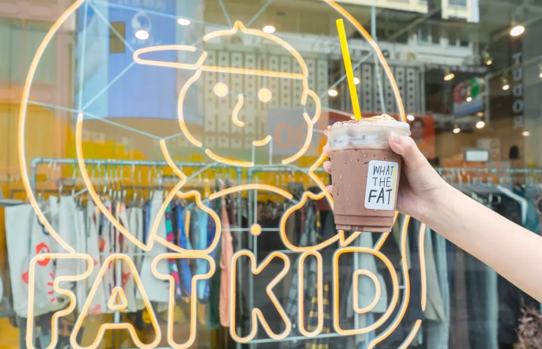 胖孩子商店(FAT KIDS STORE),坐落在暹羅廣場(Siam Square)第5巷,黃澄澄的店面裝飾特別刺眼,既是出售網紅品牌的服裝店,又有一個小小的吧台賣飲料,價目表上只有3款:分別是冰巧克力、熱巧克力和布朗尼。