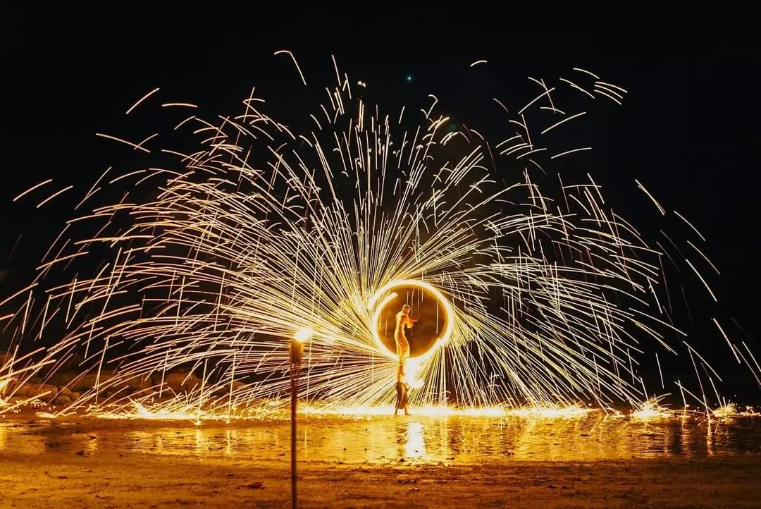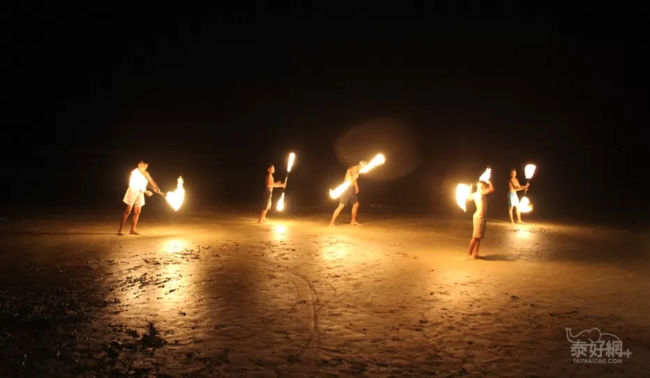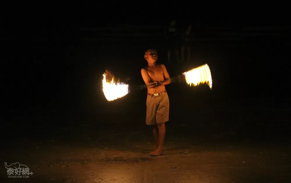 當食客吃得差不多(8點),沙灘上會有火把舞的表演,有時是成人,有時是成人帶領小朋友一起表演,木桿的兩頭點燃,伴隨鼓聲揮舞,在黑夜中格外的引人注目,愈到最後他們展現的舞藝愈高超,最後在掌聲中結束。