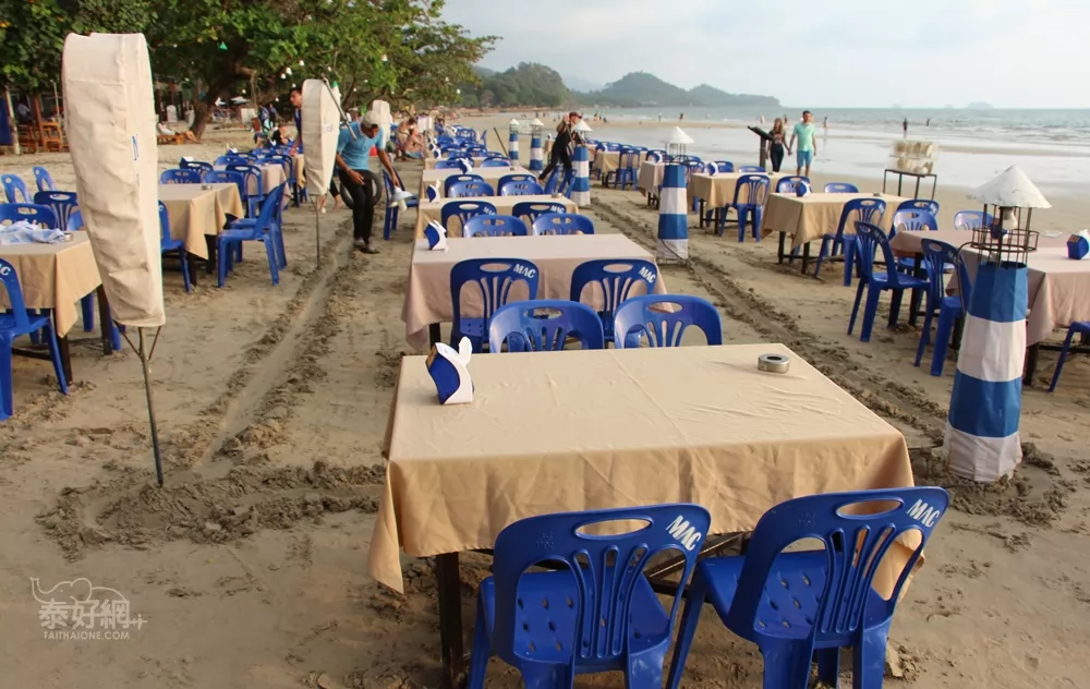 夕陽西下的時候,各飯店所屬的餐廳就有工作人員忙在佈置,擺桌椅、餐具,整理沙子、留出輸水道。