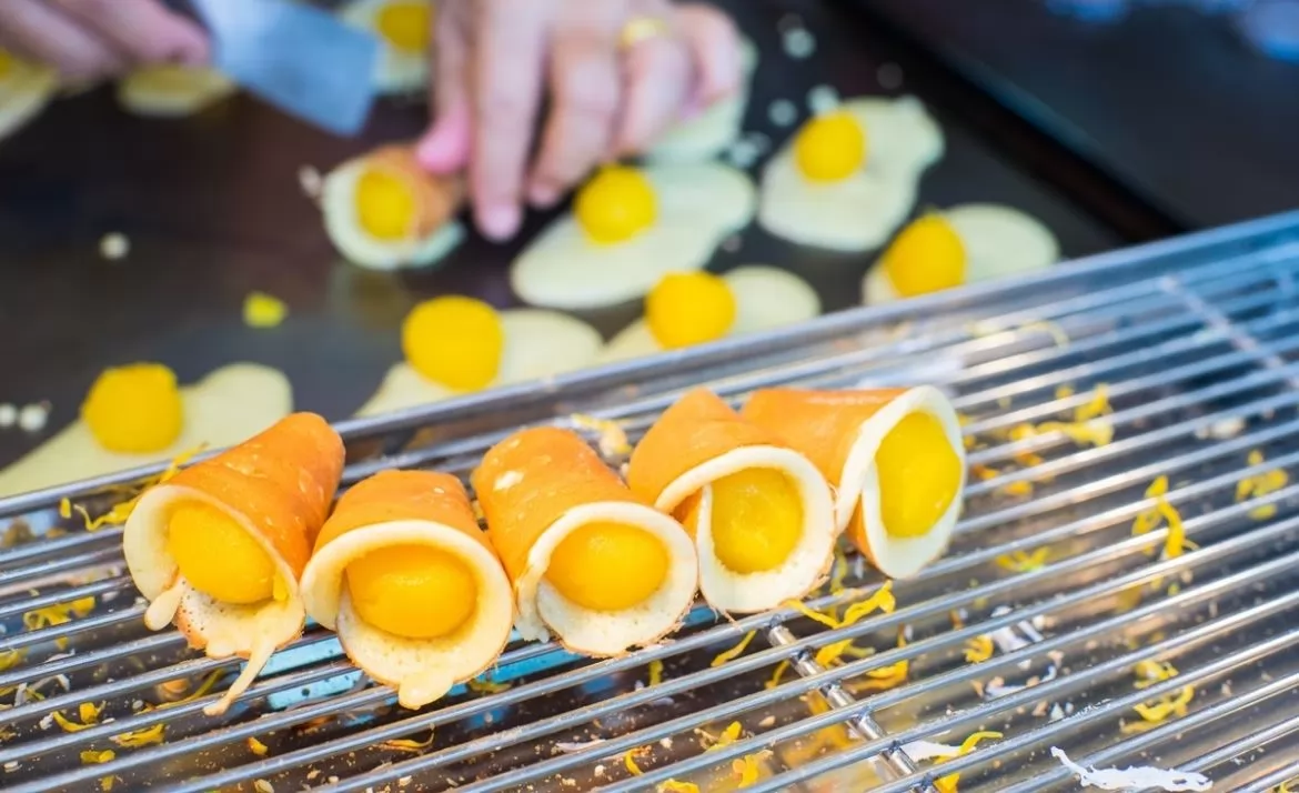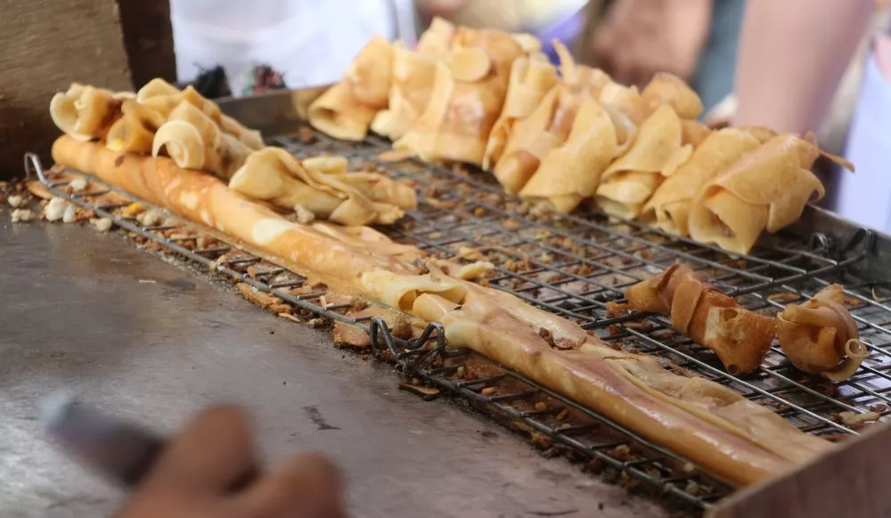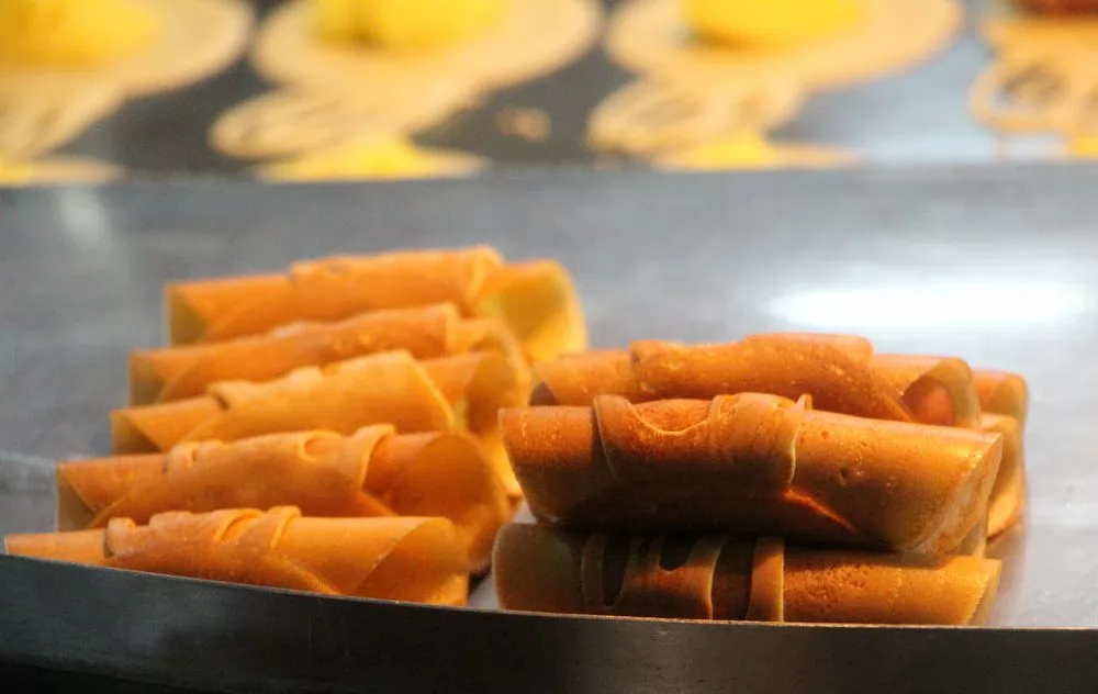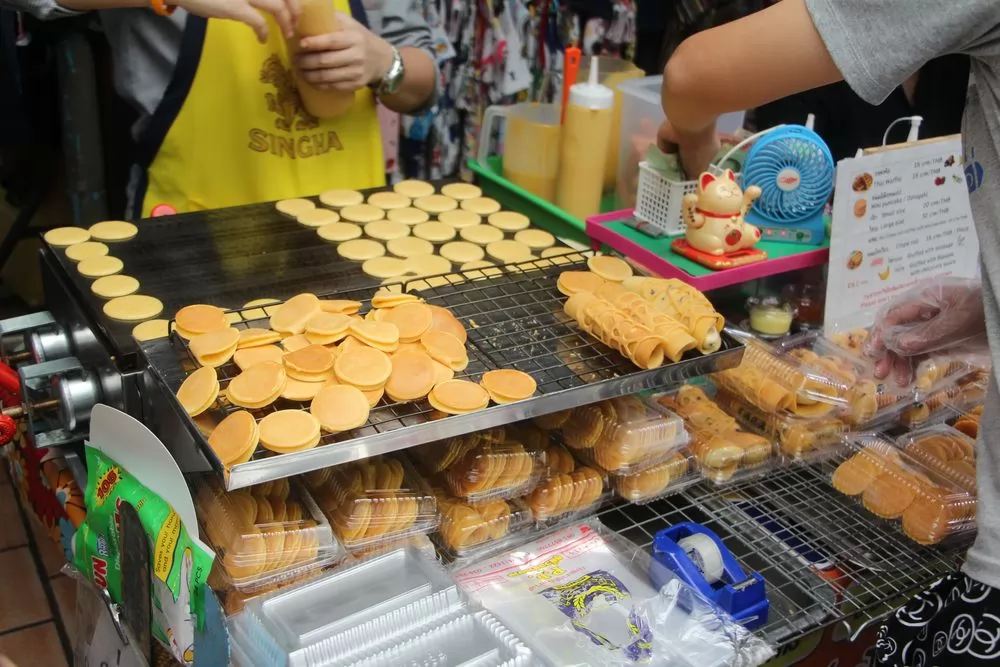 東京捲(ขนมโตเกียว)—泰式煎餅的原型是日本動畫片中哆啦A夢最愛的銅鑼燒,薄薄的煎餅皮裹上各式各樣的餡料,如香腸、鵪鶉蛋、奶油等。