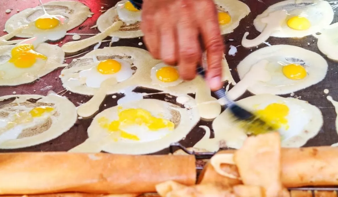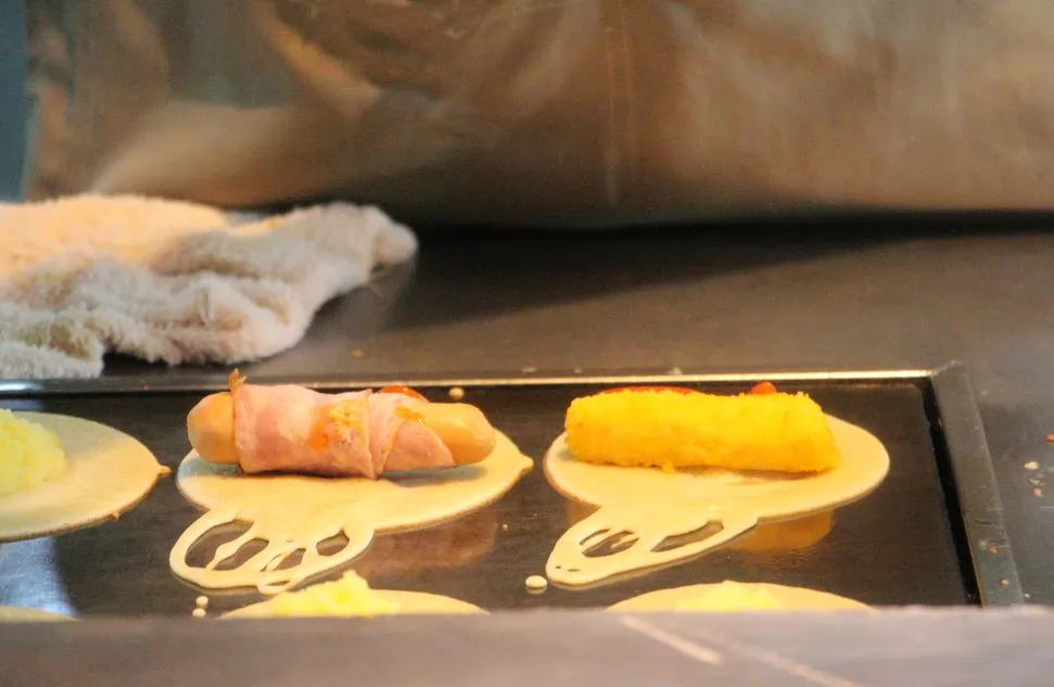 它是從鐵板上誕生的,在熱熱的鐵板上澆上麵糊,再放入肉末,鵪鶉蛋,香腸,或是奶油甜醬,然後把它包裹起來就可以了。