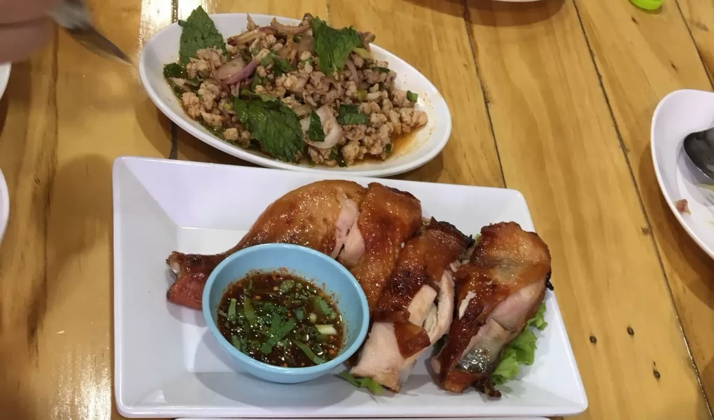 都說曼谷街邊的烤雞好吃,這家的grilled chicken烤雞香嫩可口,聞到的時候就吞了一口唾沫。醬汁也特別棒,價格才60泰銖