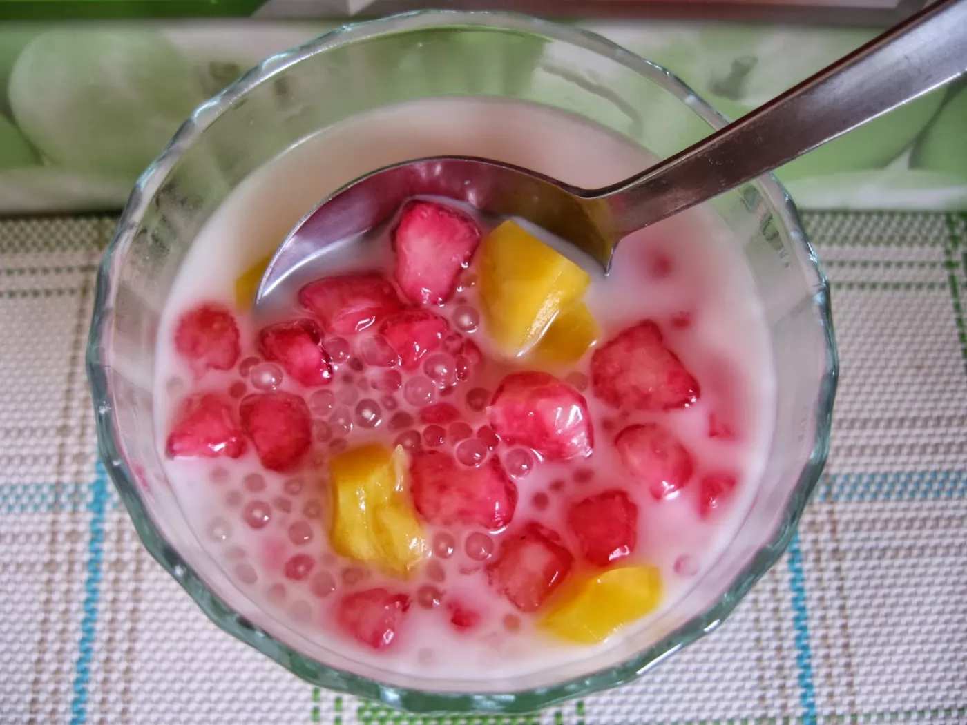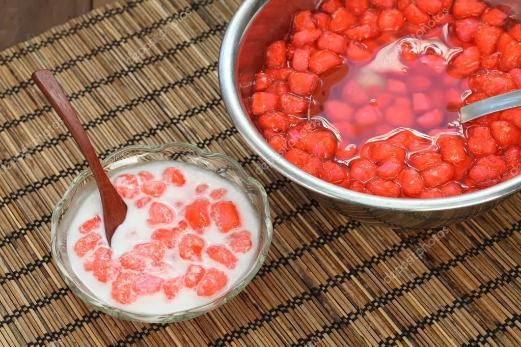 泰國的傳統甜點「椰香石榴冰(Tub Tim Krob;ทับทิมกรอบ)」,類似石榴種子的鮮紅小圓子,其實是切成荸薺的小方塊,放在紅糖水中泡10分鐘左右,然後放在木薯粉中輕輕搖動,再放入沸水郭中焯燙,每一粒都散發出誘人的光澤,看起來就非常的高貴冷豔,也被叫做紅寶石。