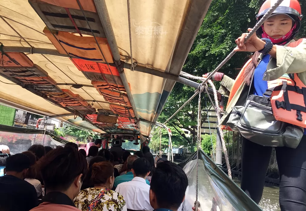 若為尖峰時段,整艘船塞滿了人,吃水就會變深,河水噴入船內,兩旁雨棚可以幫你擋住髒水濺身;另一種功能就是防止乘客往外跌落。
