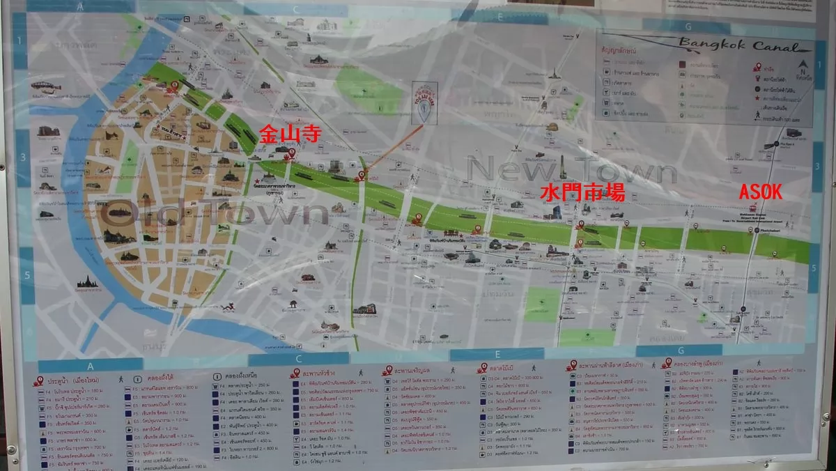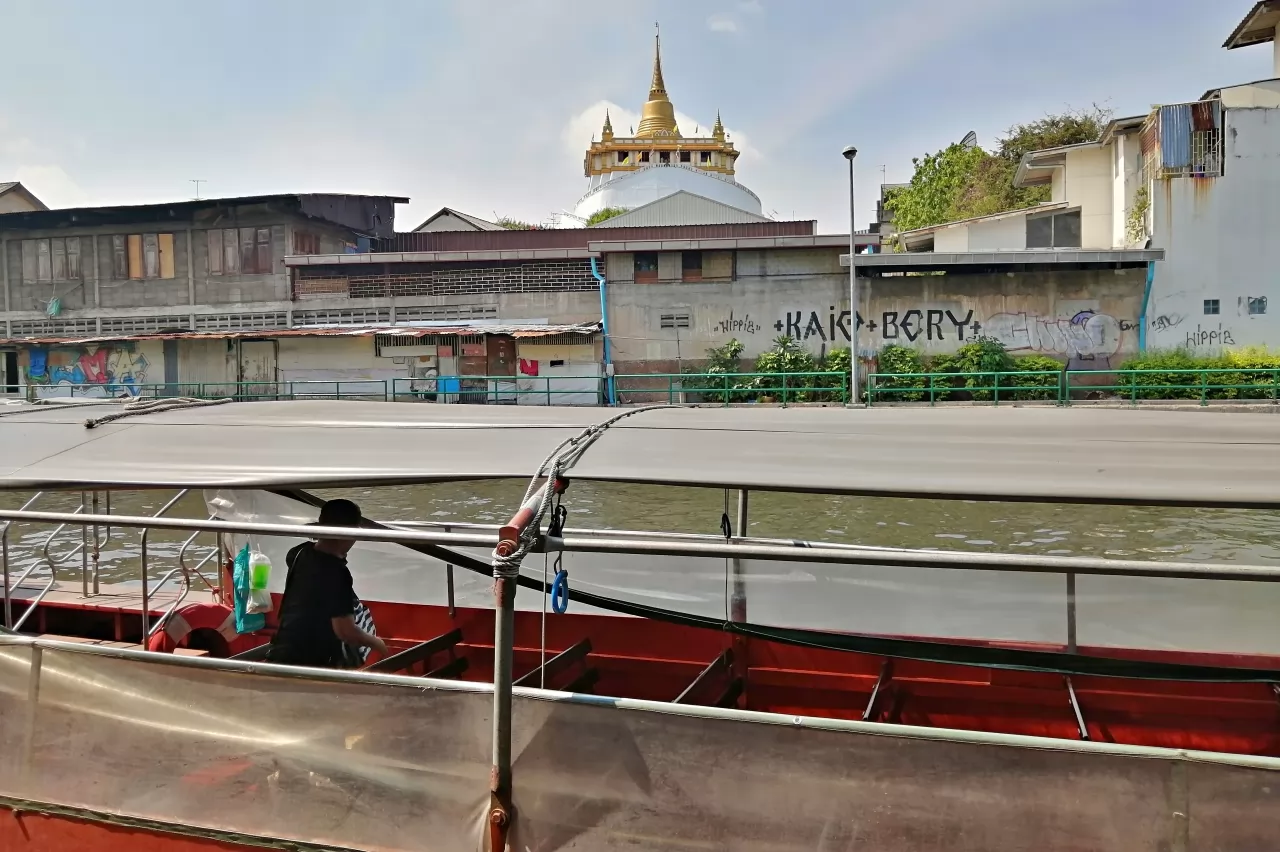 從Asok 站前往金山寺(Panfa Leelard Pier),途中要在水門市場(Pratunam)換成西線的交通船, Golden Mount Line河道較窄且深度較淺,因為舊城區的低路橋較多,要換艘矮船,換船時只需拿著原票根,無須補票,即可抵達金山寺。