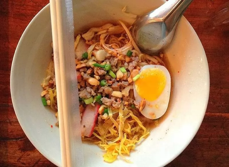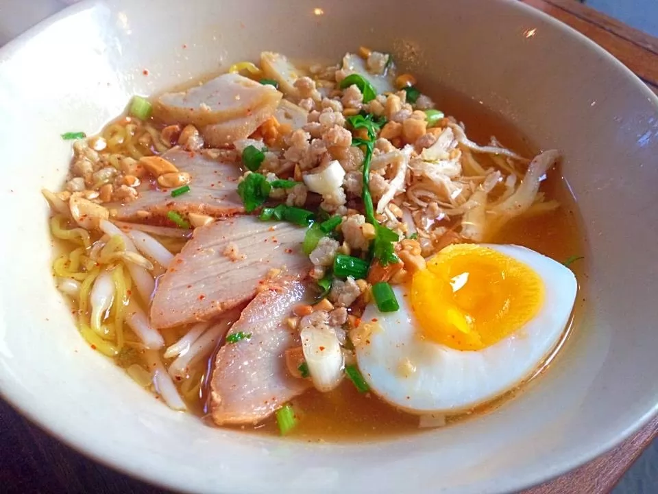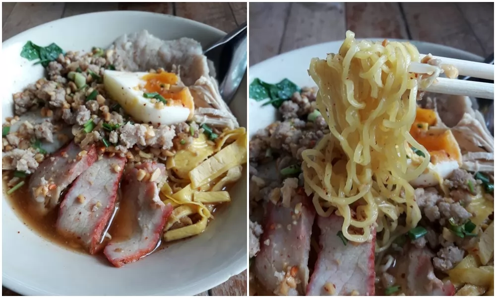 他們家特色的雞蛋麵很是美味,ก๋วยเตี๋ยวไข่ต้มยำ,用料很考究(切片紅燒肉、魚丸、雞絲、半顆水煮蛋、油炸乾麵條、蒜抹、蔥、碎花生等)而且食材很新鮮,是很地道的泰式麵條,Q彈,象哥百吃不膩,價錢在59-89銖之間。