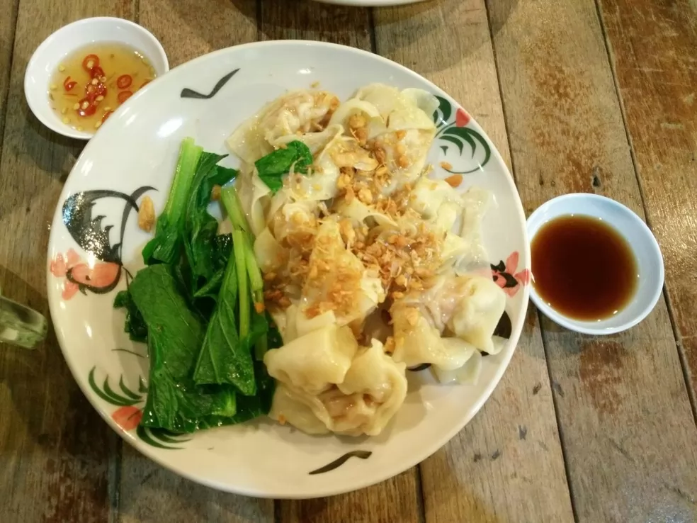 這裡也有餛飩(蝦餃),1盤89銖,附有青菜和兩種沾料,超好吃!