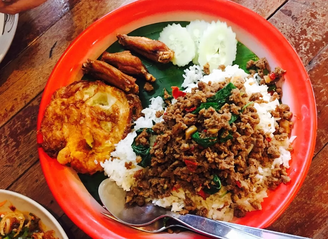 另外,值得象哥力推的打拋肉飯,用鐵盤裝,道地!可以吃兩個人,1份119銖。