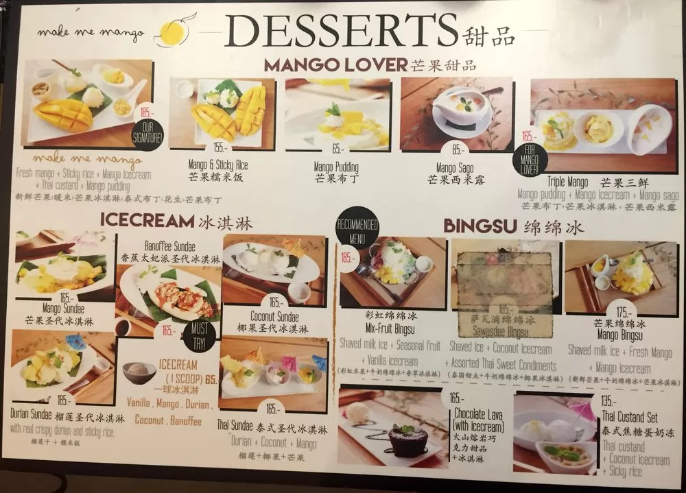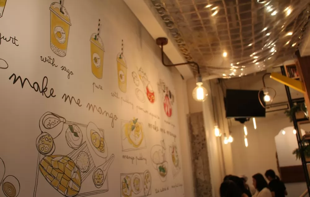 3層樓房的店是狹長型格式,把甜點畫1F在牆上,櫃台提供正式菜單,備註簡體中文,以芒果為主,也能吃到榴槤、西瓜、椰子、香蕉、草莓等水果。