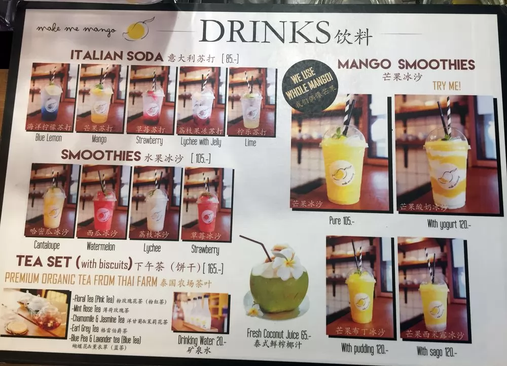 還有販賣飲料、甜點等,如清涼的芒果冰沙(105銖),香氣四溢且帶有果肉豐富口感;獨家的芒果咖啡,入口後嘴中慢慢散發芒果清香;有果肉的芒果冰淇淋,風味濃郁香甜且滑順;限外帶的鮮芒果肉冰棒,冰鎮芒果肉口感。