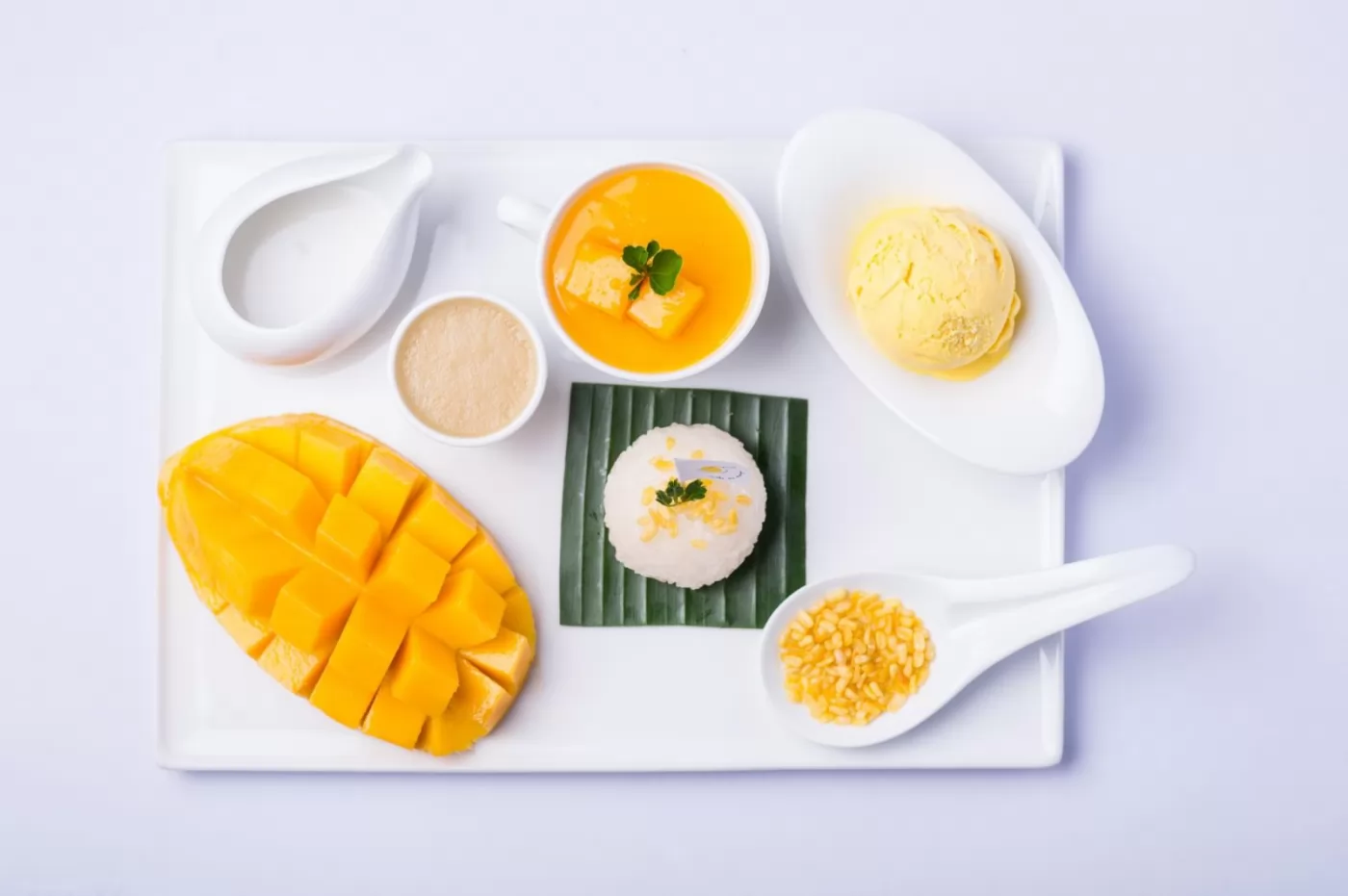 Make Me Mango Signature Set (185銖):新鮮芒果、芒果布丁、冰淇淋、椰奶糯米飯與泰式布丁,附上椰奶與花生,將經典芒果糯米飯提升更高層次。