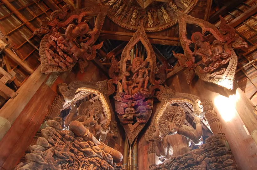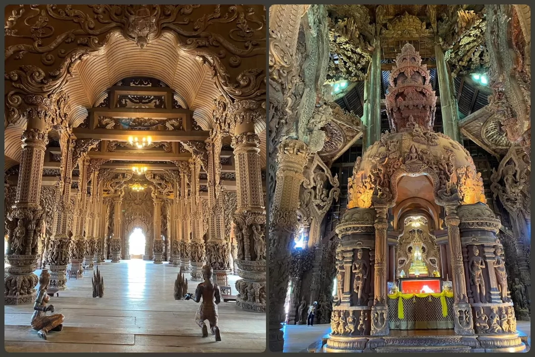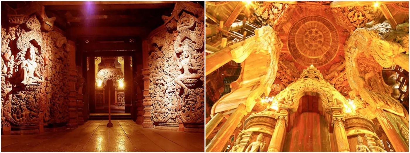 從門口到大殿有一段路,真理寺高100米、寬100米,全是由木材雕建而成,設計風格以亞洲傳統藝術風格和泰國曼谷王朝的華美風格為主,展現人與天地宇宙間的關係以及泰國的精湛木雕工藝。