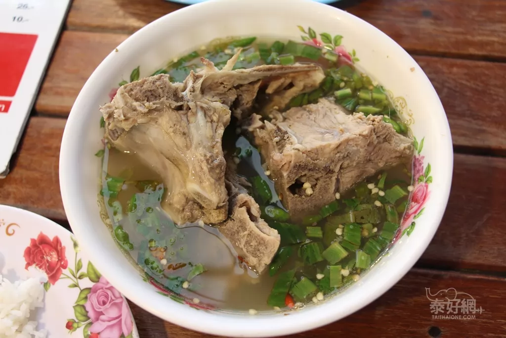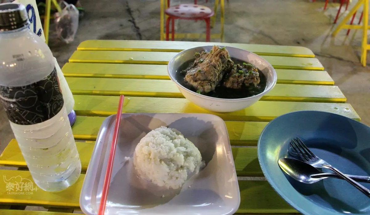 這裡有家泰式酸辣豬脊骨的餐車,1-2人份的80銖,可以加1碗白飯來搭配,雖然看起來是綠綠油油的,如果認為一點都不辣,那就大錯特錯啦!裡面放了很多超辣的綠辣椒,不小心吃到,包你辣嗆到喉嚨裡,猛灌水。