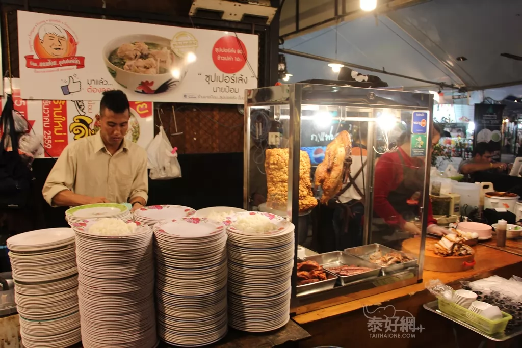 這家泰式酸辣豬脊骨的餐廳,在HuaMum夜市(曼谷Lardprao區Kaset-Nawamin路),客人隨著夜色愈來愈多,雖然不用排隊,但人氣也是超旺的。