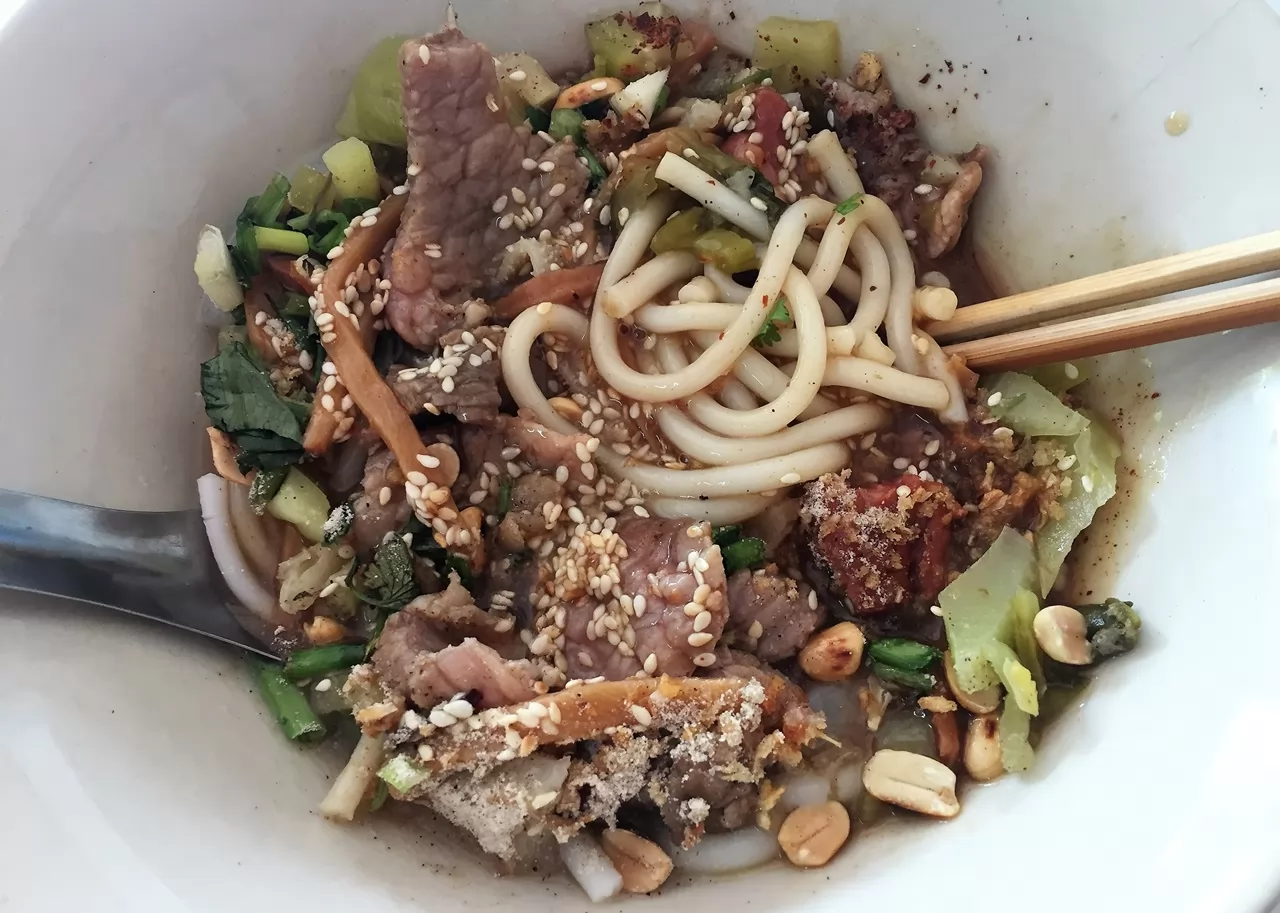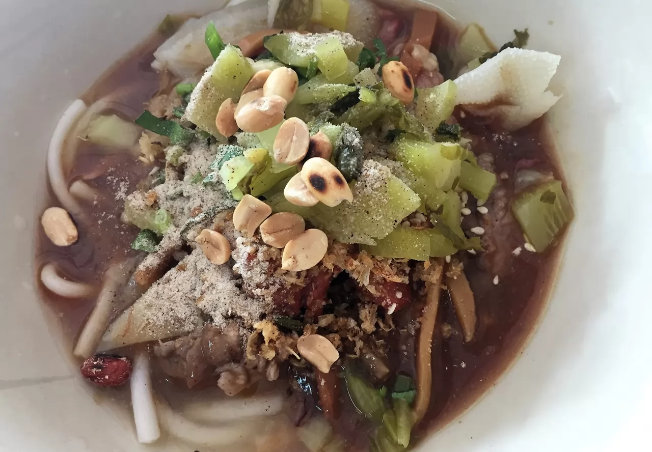 泰客點了海南乾米線豬肉口味,很快上桌,碗裡除了米線,還有豬肉片、蘿蔔、花生米、芝麻仁末、酸菜、胡椒粉等,吃起來的味道非常特別。