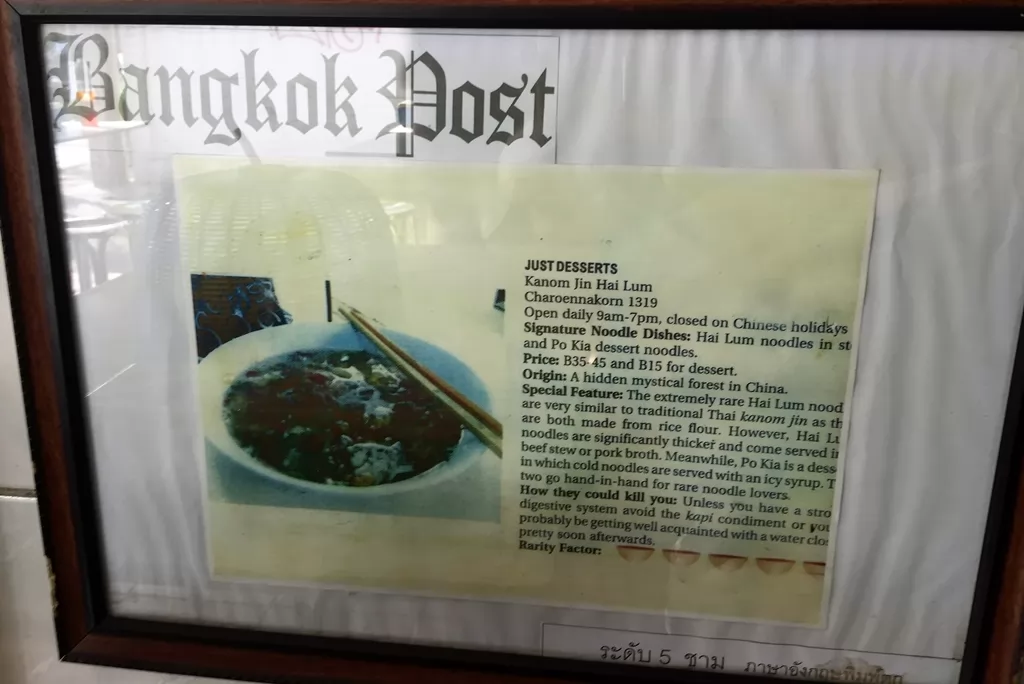 門楣上是店名ขนมจีนไหหลำ,簡陋的餐桌和牆上掛著英、泰文媒體的報導文章,這裡賣的海南米線很簡單,有湯的和乾的兩種,可選擇豬肉和牛肉口味,普通1碗40、50銖;特級的則是50、60銖。