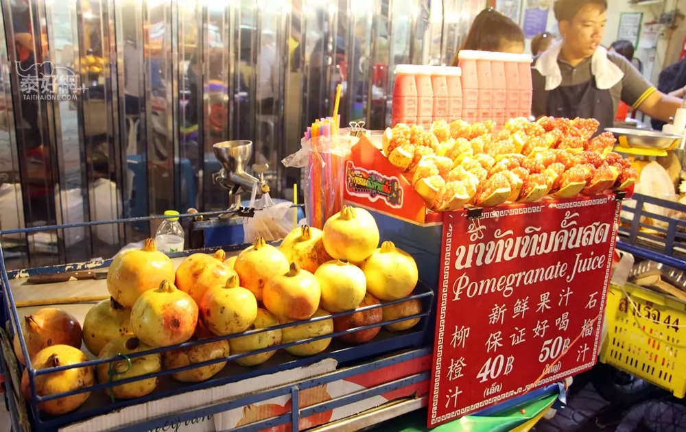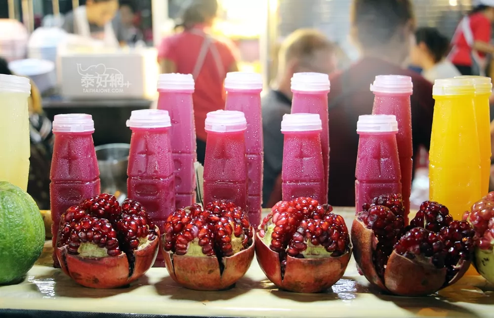 鮮榨出來的石榴汁,這紅石榴汁,味道鮮甜,絕對不澀,1大杯或是1瓶的新鮮紅石榴汁40-60泰銖,很划算。