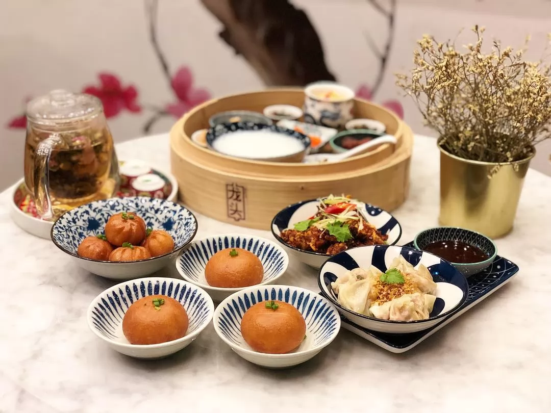 中式茶飲餐點,早餐(套餐120銖),清粥小菜(潮州粥—1碗白粥加8樣配菜,價格129銖),點心方面:豬肉燒賣(69銖)、豬肉叉燒包(49銖)、流沙包(29銖),有著濃濃的潮汕氣息。