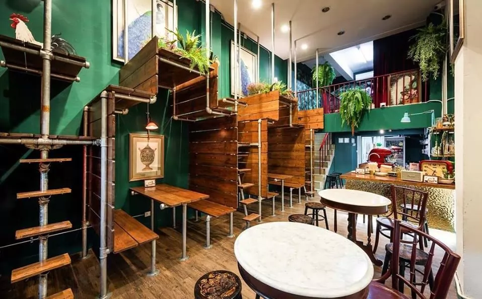 走的是復古中國風,運用創意在原先平面的牆壁上彩繪雞和白兔等,店中立式階梯的座位設計,把狹窄的空間變成了上下交錯的立體座位,增加一些現代感和座位,想要坐在高處的顧客就要像爬雙層床一樣爬樓梯了,當然高度和設計都保障安全,非常有趣,給來訪的客人一個屬於自己的小空間,這也是這家店最大的特色,成為很多網友自拍打卡的地方。