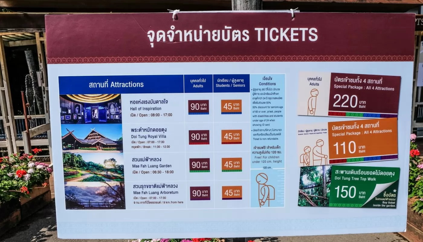 萊東區內有4處需要購票的景點,包括皇太后行宮、萊東花園、Hall of Inspiration及Mae Fah Luang Arboretum皇太后植物園。其中行宮、花園及資料館都在主園區,有售票處、商店、餐廳及市集。各景點獨立門票90銖,4景點套票220銖。