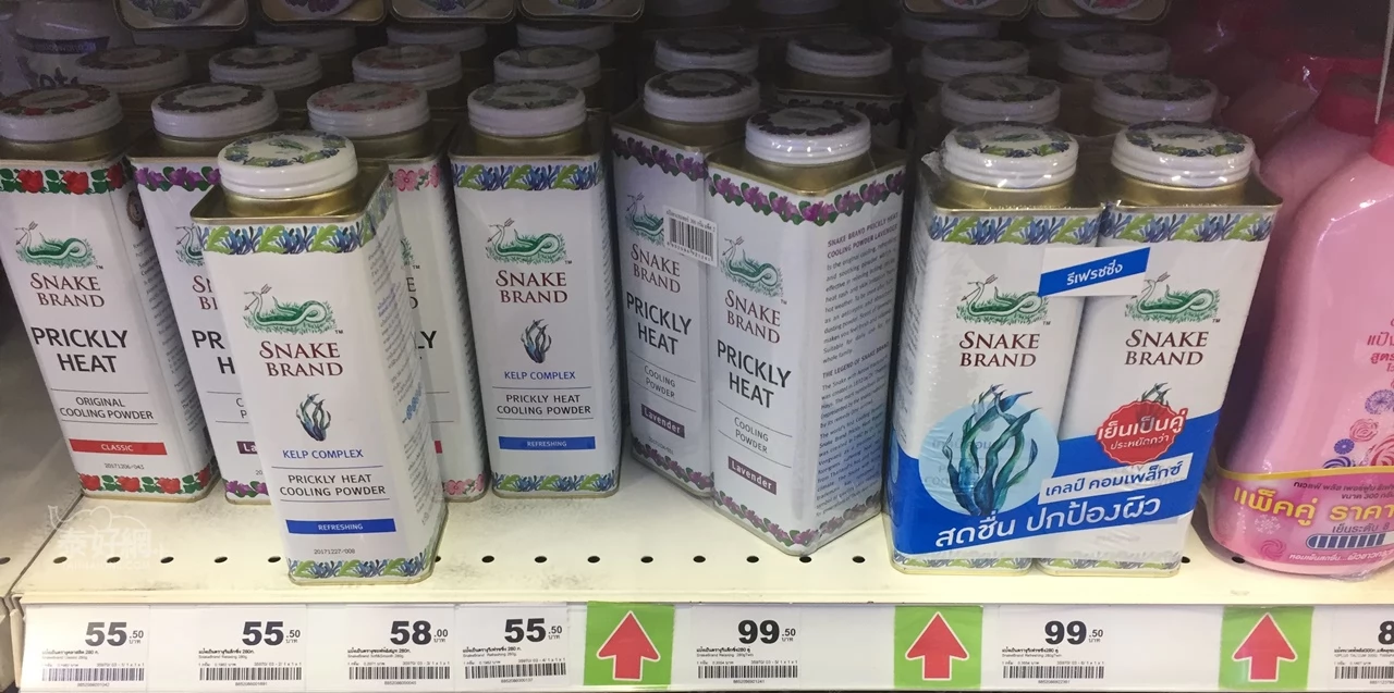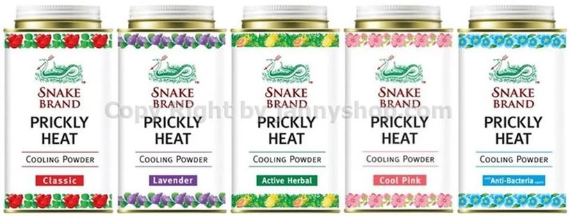 標榜是全世界傳奇超清涼的第1品牌,「蛇牌( แป้งเย็นตรางู;Snake Brand)」是泰國老牌子的爽身(痱子)粉,在1947年創立,因為罐子上面印有蛇的圖案而聞名,目標是針對外來遊客,幫助他們對抗泰國又熱又濕的天候。【2018.7.26更新】