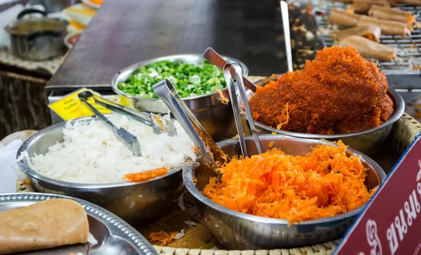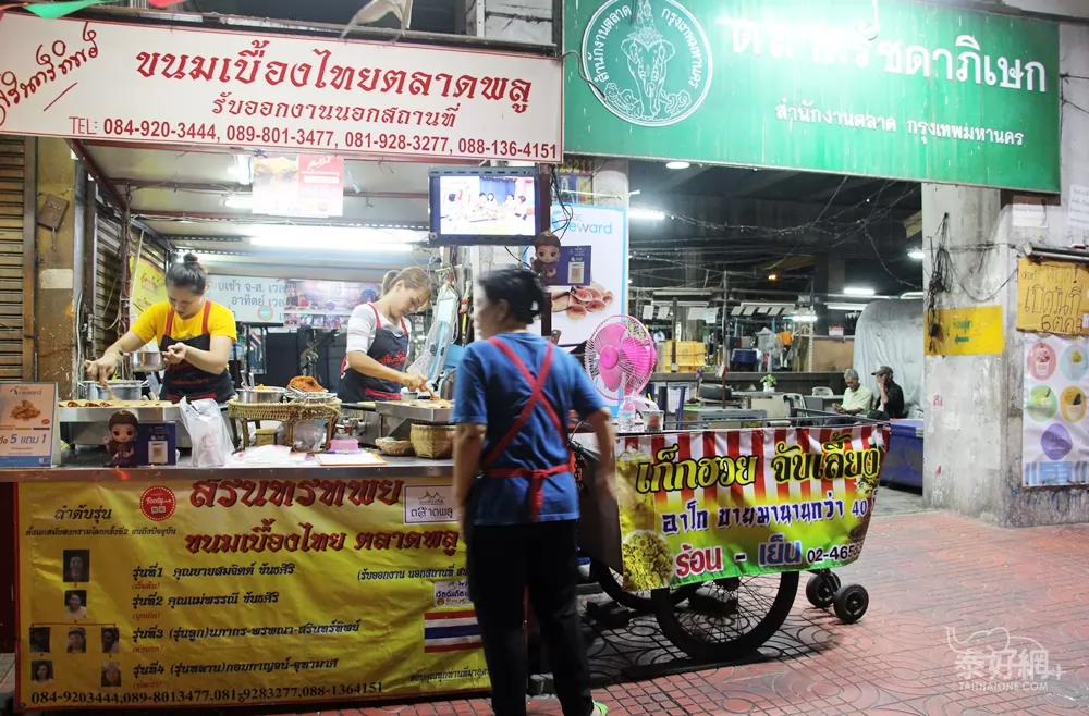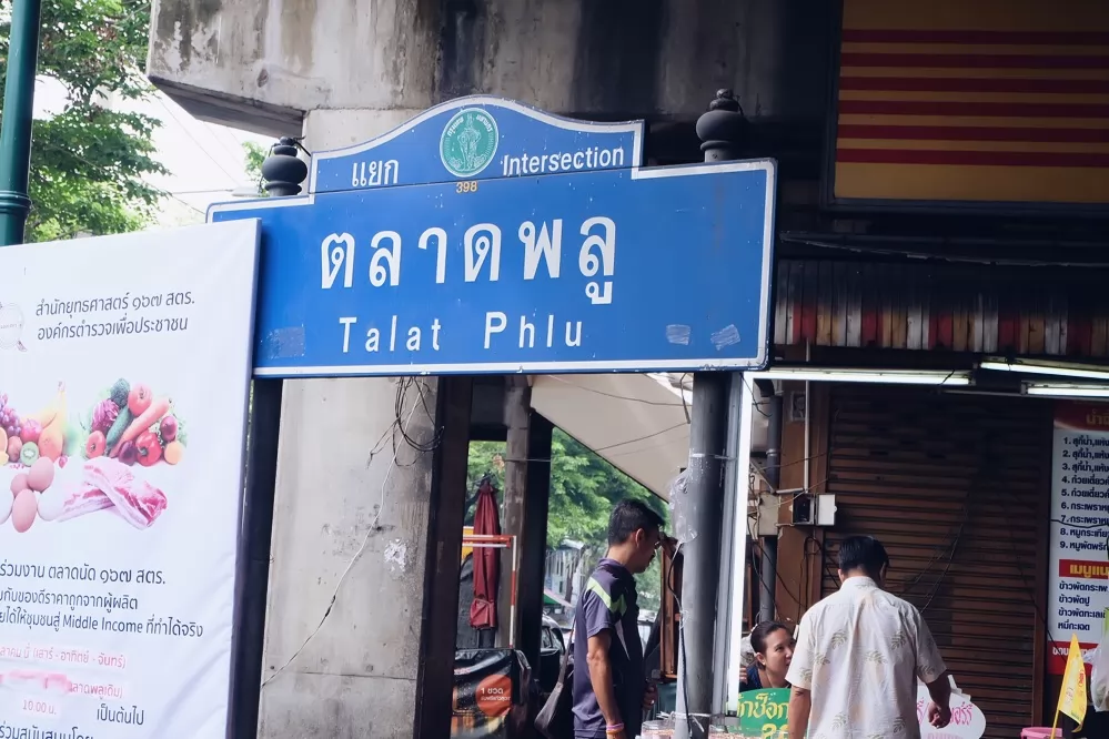 走出噠叻噗(Talat Phlu/ตลาดพลู)火車站,往右轉到高架橋下的市場,有人排隊的美食攤,中間的1家就是這家知名的小吃攤了。