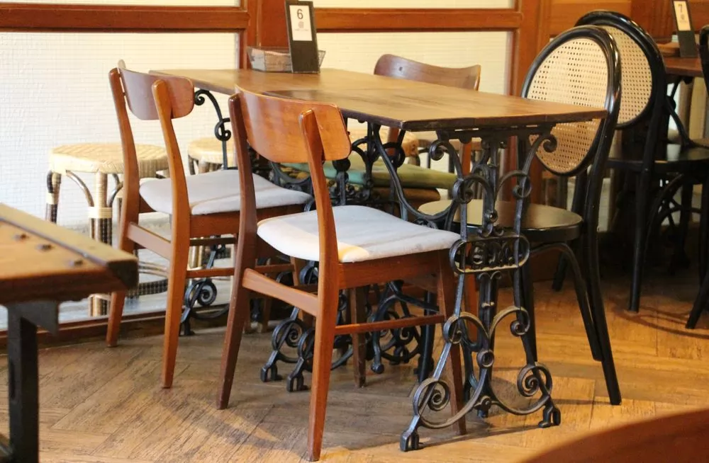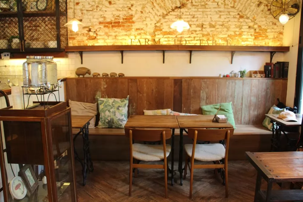 裡面只有幾張小桌,因為裝修陳設較為另類,復古裝飾和用裁縫機為桌腳,燈光的蓋罩也很特別,木板+白牆的簡樸,所以都很受歡迎。
