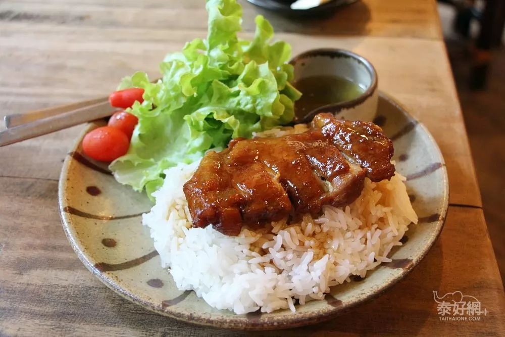 妖妹點了招牌的豬肉飯(Roasted Pork + Hong Hong Kale),112銖。豬肉香嫩,和著帶甜的醬汁很下飯;自製橘子醬配生菜和小蕃茄,吃得很健康。