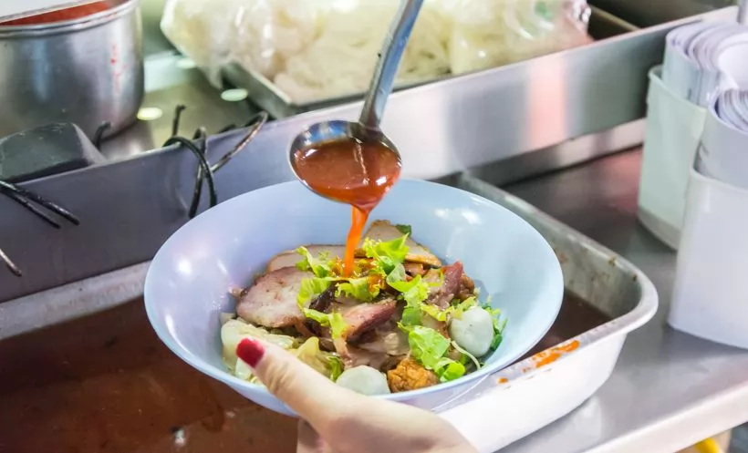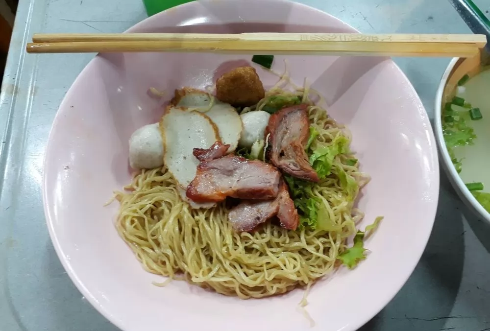 叉燒肉,用舊配方祕料醃製,再用火爐燒烤到香脆,再切成片,同時把叉燒肉滴出的甜油汁淋在煮好的麵上,拌出油亮的黃色,加上醬油,然後還有蝦丸、魚丸、餃子、蔥花,1碗40-50銖,如果點乾麵,要加熱騰騰的湯頭則需要多5銖。