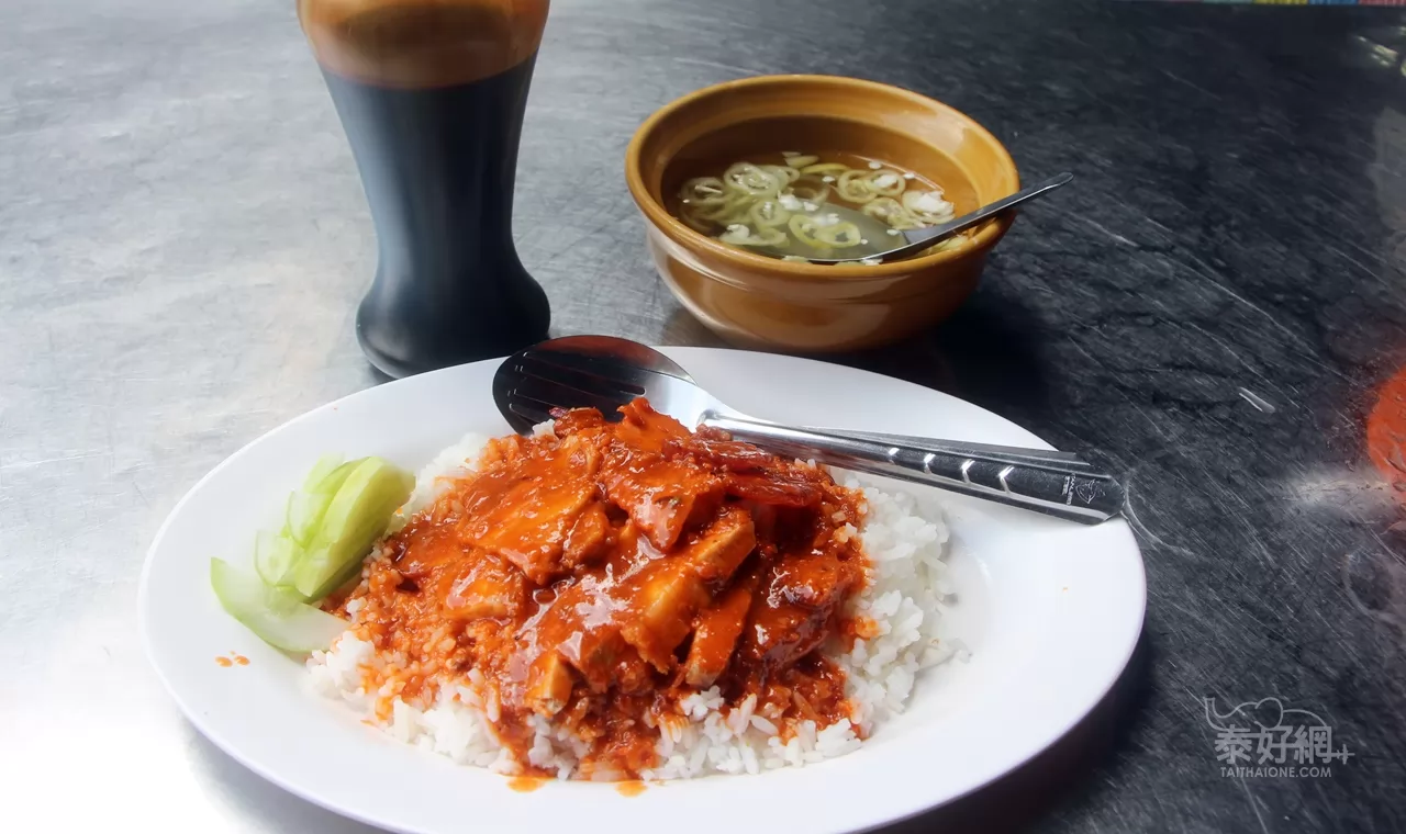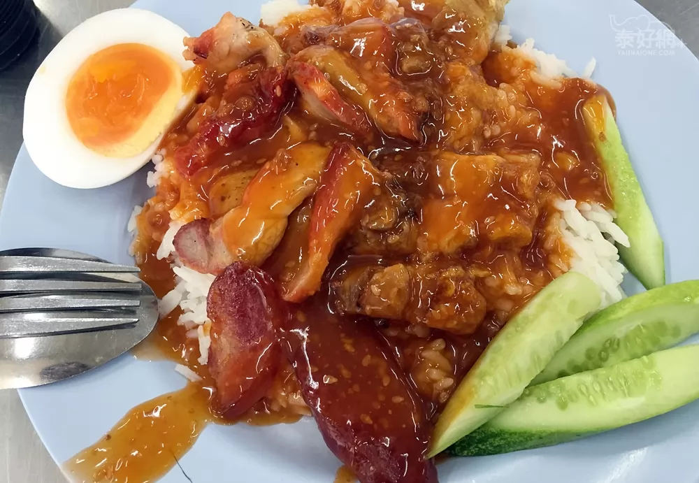 最熱門暢銷的當然是紅燒豬肉飯(綜合):白飯+紅燒豬肉+中國香腸+脆皮燒肉+半顆水煮蛋+小黃瓜,光看到門前玻璃櫃裡懸掛的紅燒豬肉、脆皮燒肉,就流口水,再淋上特制的紅醬汁,征服了很多老饕客的胃,好吃沒話說。普通1盤是50銖,便宜又管飽,超值!