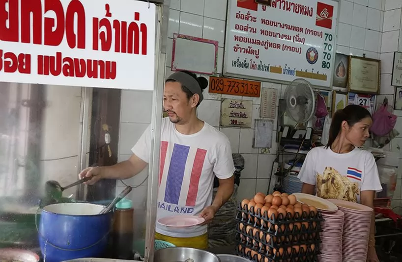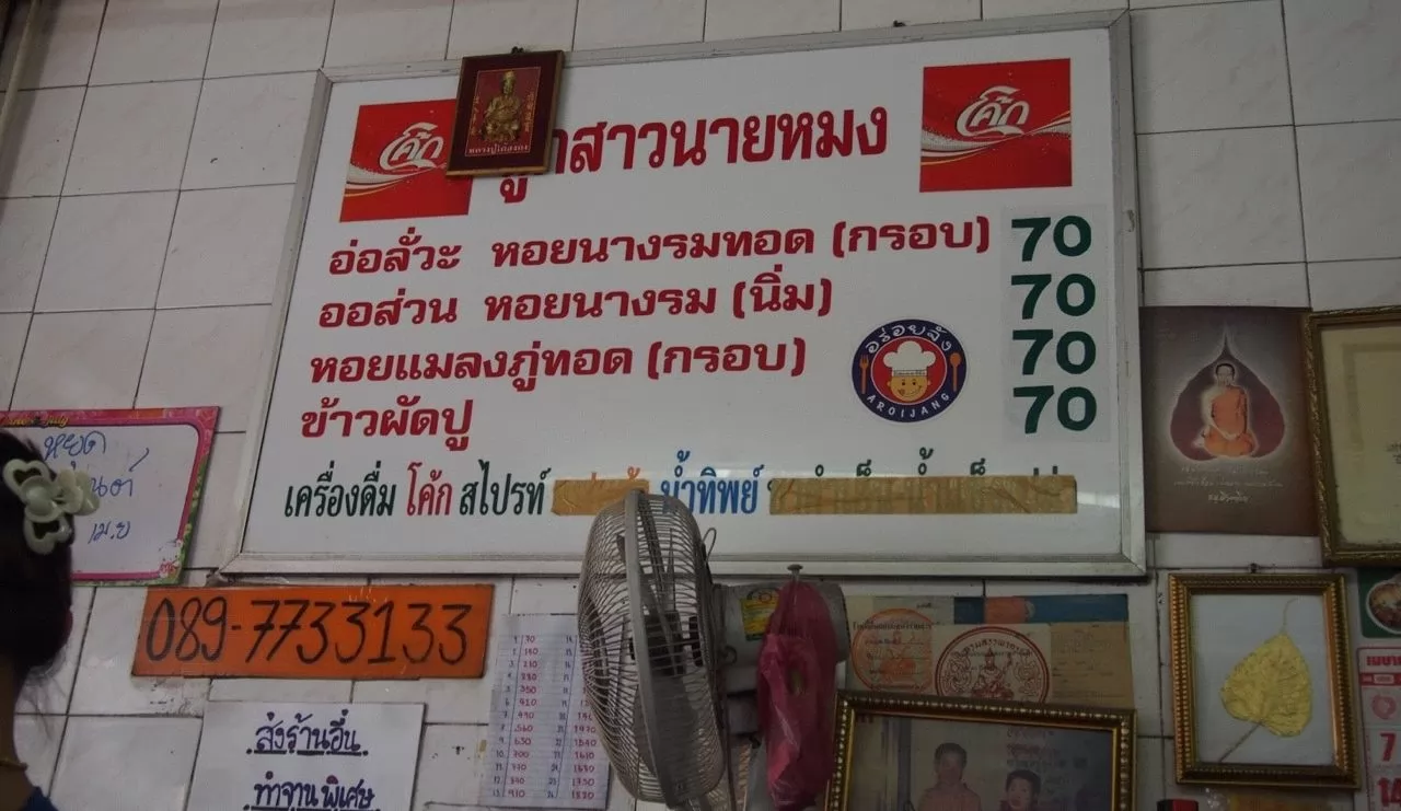 店就在曼谷中國城的PhlapPhla Chai Road,賣的蚵仔煎(Hoi Tod;หอยทอด),是由潮汕人傳入,有兩種煎法,一是嫩煎(Or Suan;ออส่วน),大顆飽滿的蚵仔配上雞蛋、木薯粉等材料攪拌勾芡後再煎,香滑軟嫩。