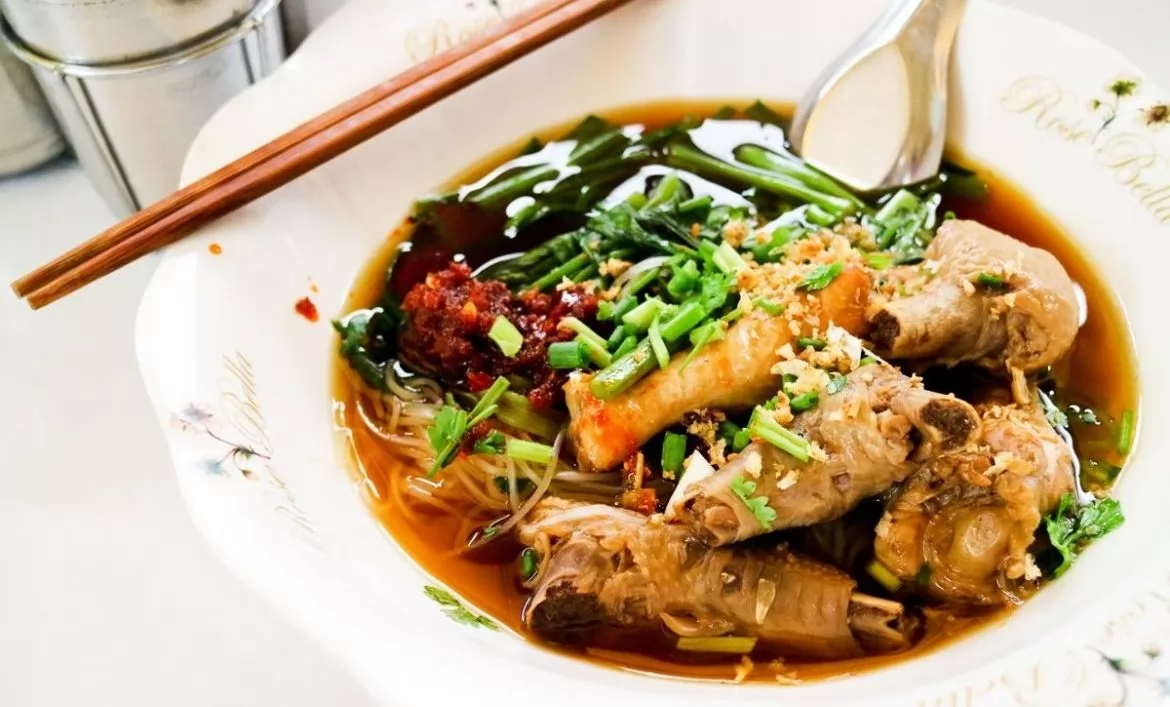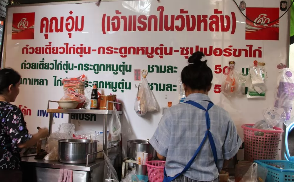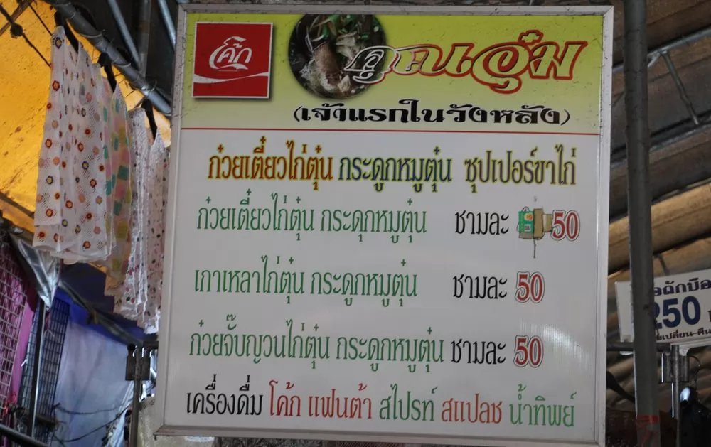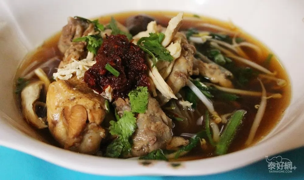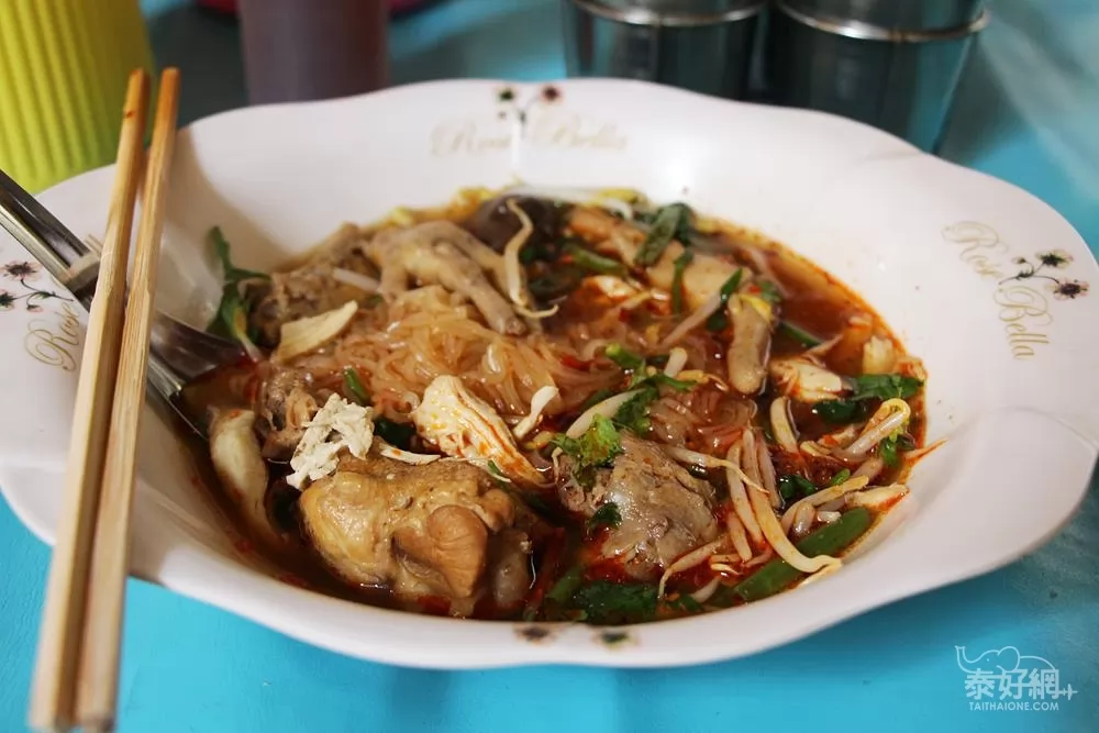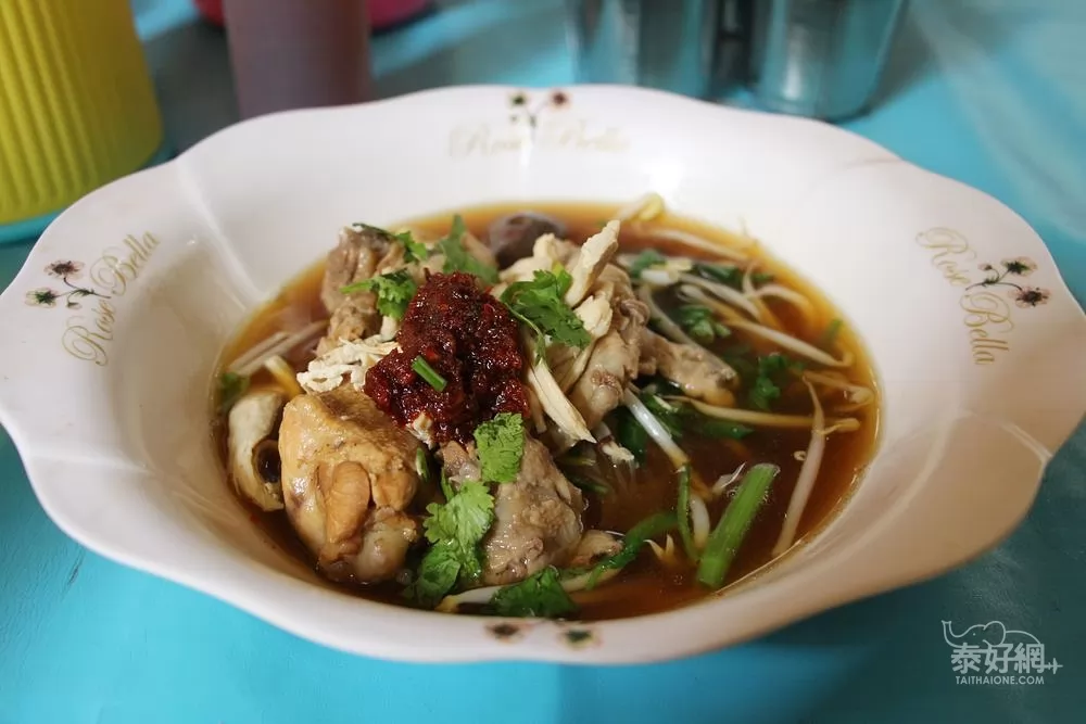除了燉雞肉,也有燉豬骨肉;粿條之外,還有高勞(เกาเหลา)、粿汁(ก๋วยจั๊บญวน)可選,價格都是1碗50銖。