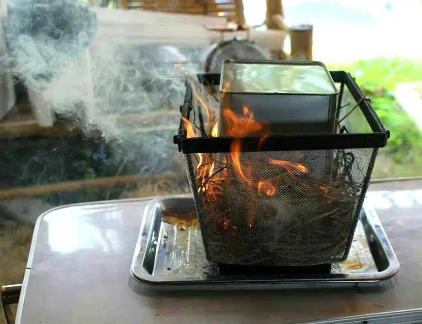 河蝦都是自己飼養的,十分乾淨衛生,這道菜用6-10隻蝦子,再配上香料與草本植物,最特別的烹飪就是採用稻草烤河蝦。