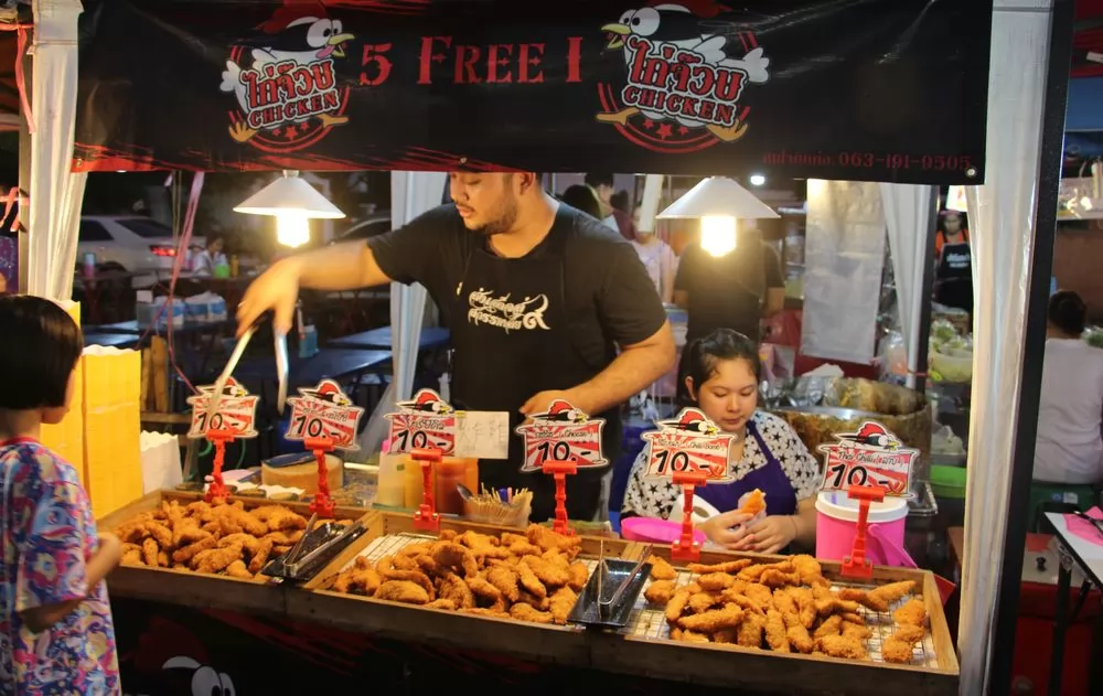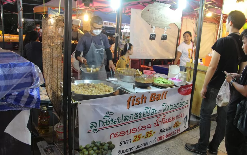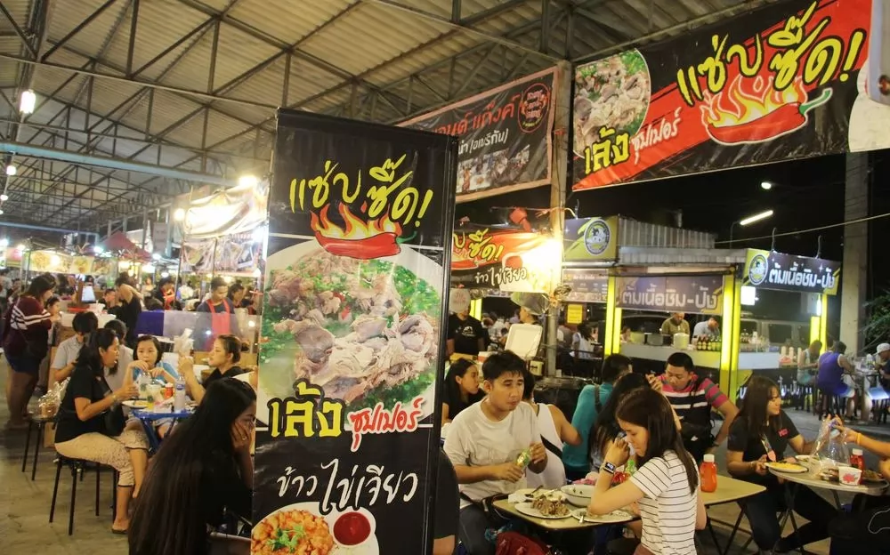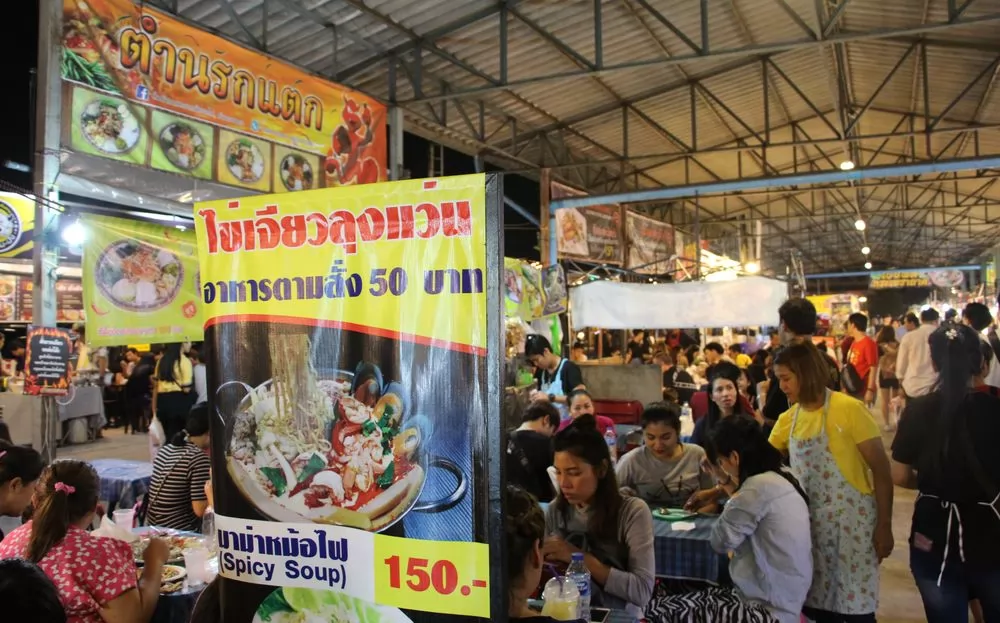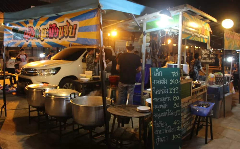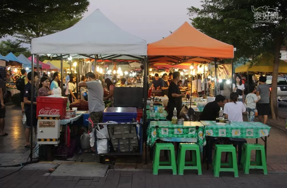 穿過走廊和停車場,經過象神廟後,進入席娜卡琳火車夜市前方,有個小吃攤位區,光是散發出的各種香味就讓人垂涎三尺,每個攤位販賣的食物都各有特色,讓人眼花繚亂,美味又很便宜,恨不得統統塞進胃裡。