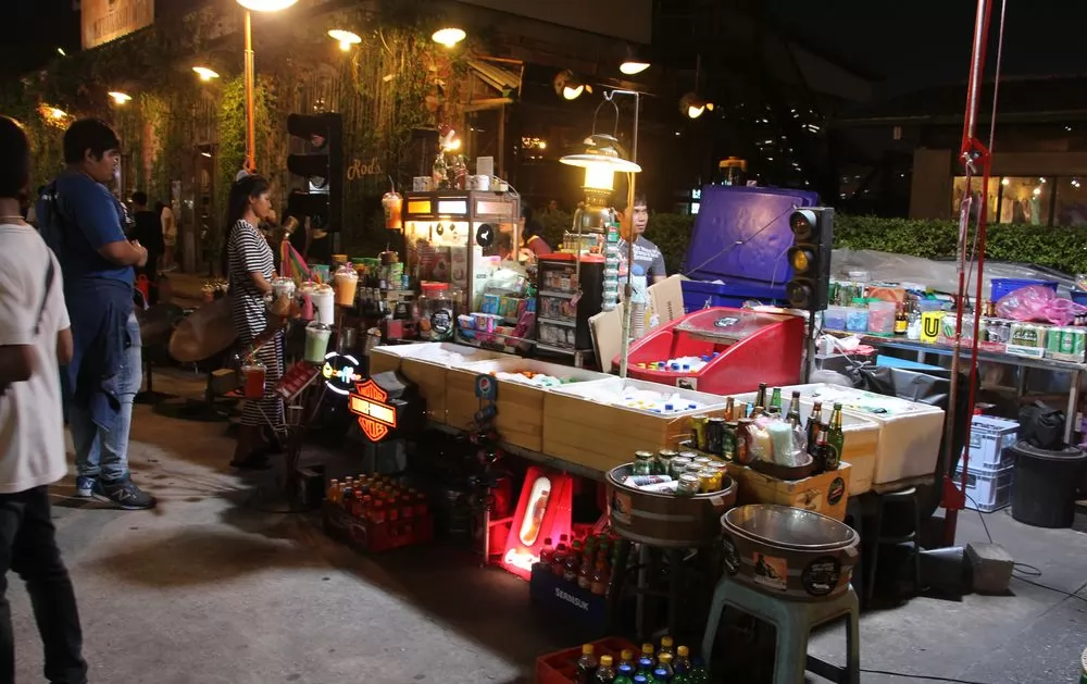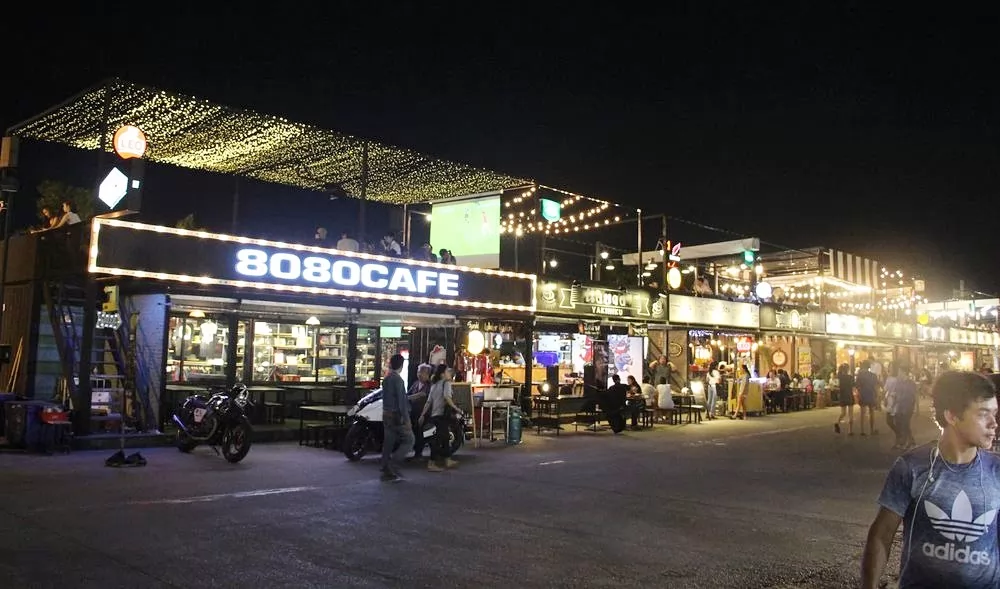 酒吧旁邊就是露天攤位區,這裡人潮洶湧,攤位密集,販賣各色商品和吃食。