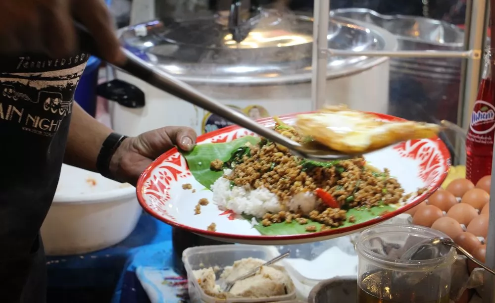 再往右邊走,有個頂棚的美食區,裡面各種美食,像是用鐵盤裝的打拋豬肉飯。