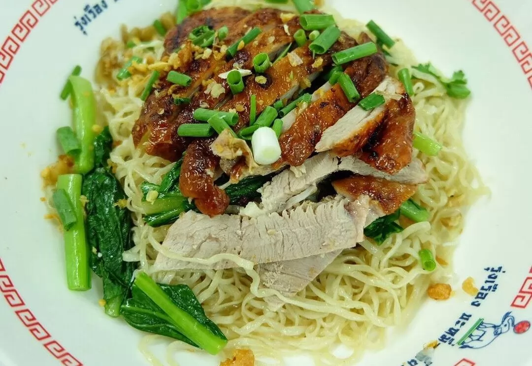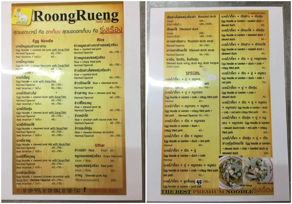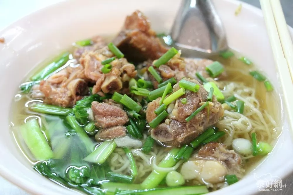 麵食方面,有蟹肉麵(50-60銖)、豬腳麵(40-50銖)、燉鴨肉麵(40-50銖)和燉雞肉麵(40-50銖)、炸豬排骨麵(40-50銖)等,也有飯類。