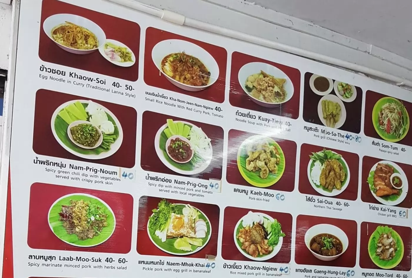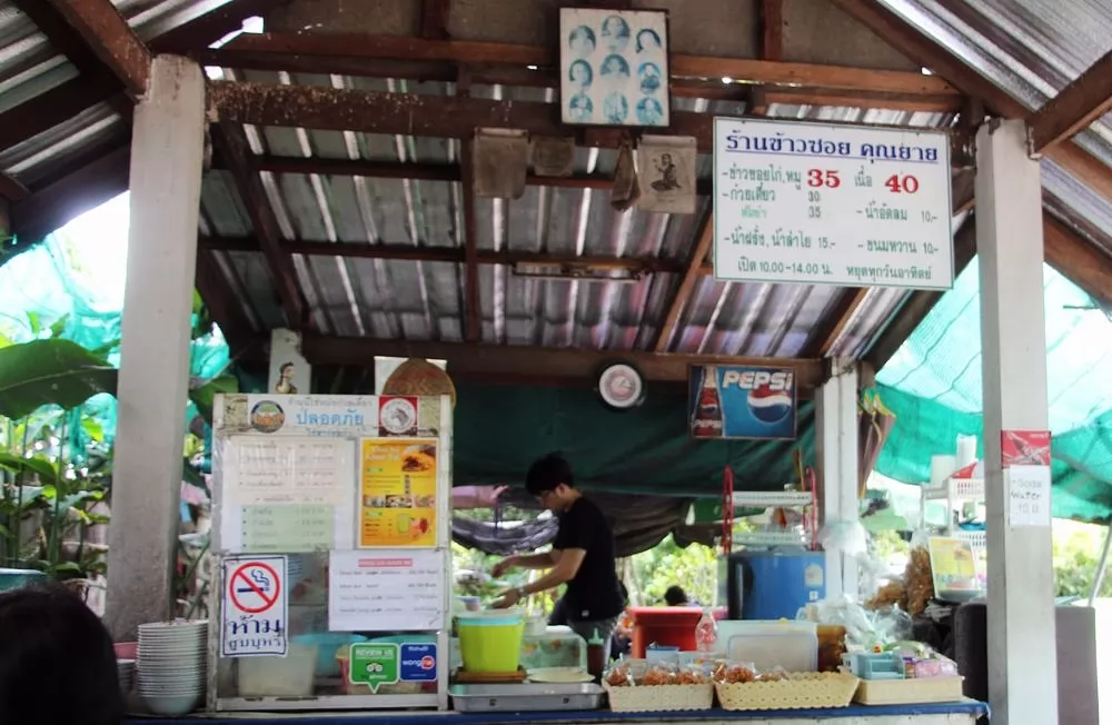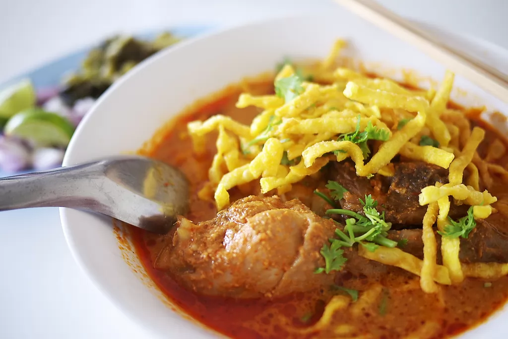 Khao Soi由咖哩、椰汁和椒薑、紅蔥等製成,湯底較濃,不太辣也不太甜,加入一般雞(Kai)、豬(Moo)、牛(Neua)等不同的主料,麵是雞蛋麵,很有嚼勁,吃得份外惹味,這樣的1碗只要40銖。