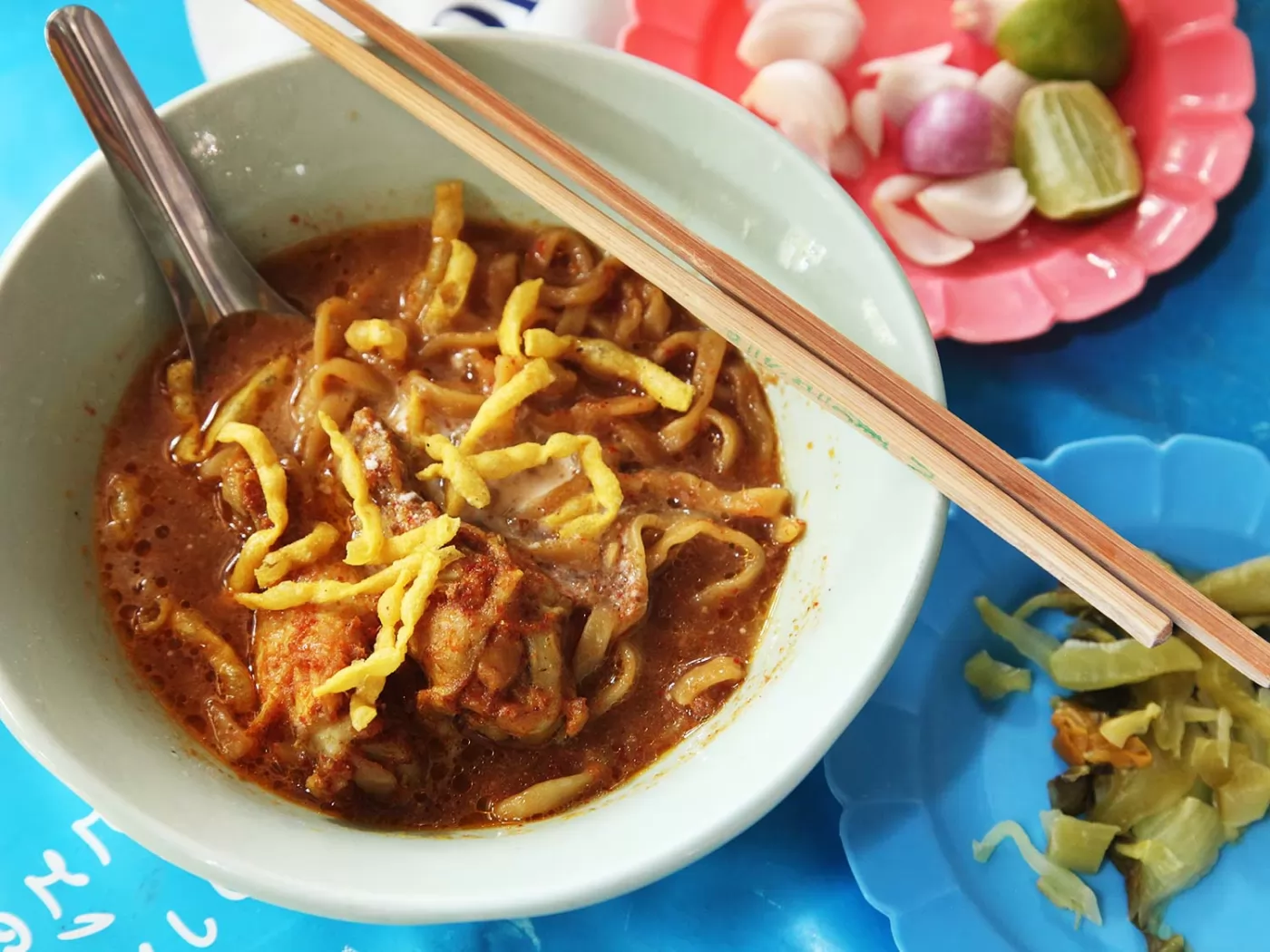 這裡的湯濃稠醇厚,有濃濃的咖喱香,椰奶很濃,又厚又甜,配上雞蛋麵,撒上炸得金黃香酥的麵條,再加上店裡用古老秘方製作的雞肉塊或者牛肉塊,和著洋蔥酸菜一起吃,那酸爽,簡直難以形容。1碗價格40銖起跳。