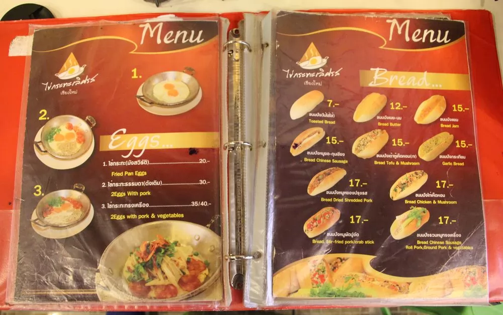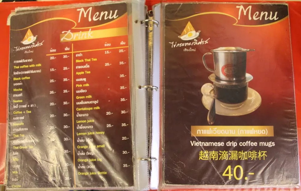 當地人想吃什麼就直接劃在點單上,觀光客看不懂!沒關係,店家有泰英和圖片的Menu,泰客看了看,套餐式早餐(60-80銖)沒有熱咖啡,只好點了份Kai Ka Ta(35銖)、奶油法國麵包(15銖)、再來1份越南滴漏咖啡(40銖)。