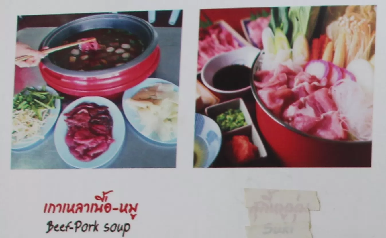 這裡也有牛肉鍋和類似 sukiyaki 壽喜燒。牛肉鍋(200銖)就是以火鍋形式上的,湯底加很多不同的材料,牛肉滿滿一碟,放進去吸收湯味,濃郁好吃!