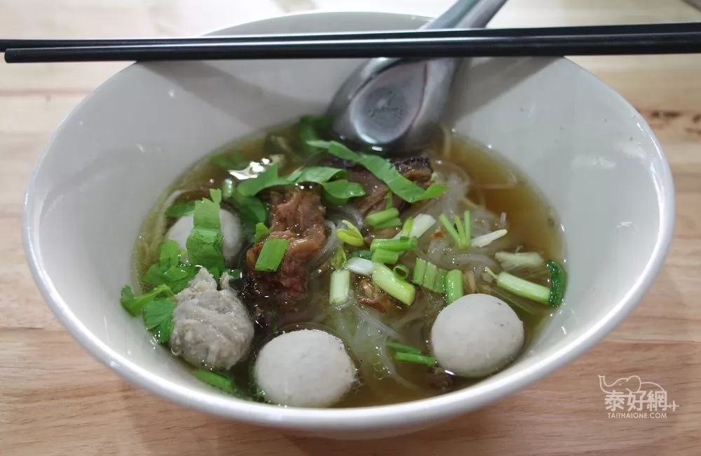 象哥點了碗牛肉粿條(1碗50銖),用料十分足,牛肉片不會煮得過熟而變得難咬,還帶有不少牛筋,加上蔥花,香氣四溢。另外,還有牛肉丸和魚丸,好呷!